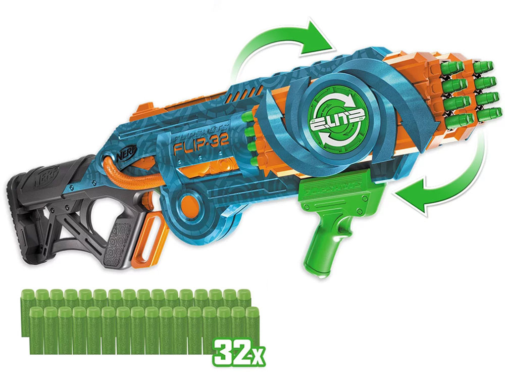 Große Abschusskanone NERF Elite 2.0 FLIP-32 von Hasbro ist für alle Schießbegeisterten. Der Werfer besteht aus zwei sperrigen, drehbaren Magazinen. In jedes dieser Magazine können acht Schuss nach vorne und hinten gerichtet eingelegt werden, so dass insgesamt 16 Läufe pro Magazin möglich sind. Beide Magazine fassen bis zu 32 Schaumstoffpatronen, 16 nach vorne und 16 nach hinten. Jede Patrone muss in den Lauf eingeführt werden, um das Magazin vollständig zu füllen. Die Pfeile bleiben an ihrem Platz, sie fallen auch bei intensiven Bewegungen nicht heraus. Nach dem Abfeuern der nach vorne gerichteten Pfeile drehen Sie das Magazin mit dem Griff an der Rolle um 180°, und der Spaß geht weiter - sehr zur Überraschung Ihrer Gegner.