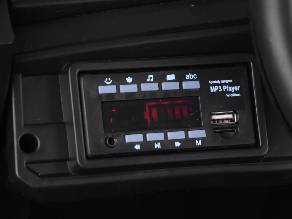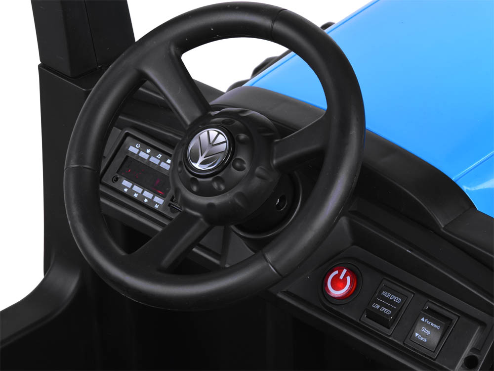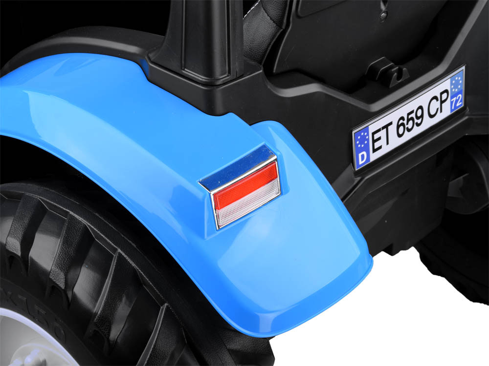 Dank der beiden Motoren kann das Fahrzeug problemlos Hügel, unebenes Gelände oder Gras bewältigen. Der Traktor ist mit einer Bremse ausgestattet, die aktiviert wird, wenn der Fuß vom Gaspedal genommen wird. Die Geschwindigkeit des Fahrzeugs wird über einen Schalter am Armaturenbrett (langsam, schnell) und eine 2,4-GHz-Fernsteuerung aktiviert, mit der die Eltern das Fahrzeug vorwärts oder rückwärts fahren können. Die Richtungssteuerung erfolgt ferngesteuert, aber auch manuell. Die Vorwärts- und Rückwärtsfahrt wird über den Vorwärts-, Stopp- und Rückwärtsschalter oder über die Fernbedienung gesteuert.Das mit einem Musikpanel ausgestattete Gerät sorgt für mehr Spaß im Garten, auf dem Spielplatz oder im Sandkasten.