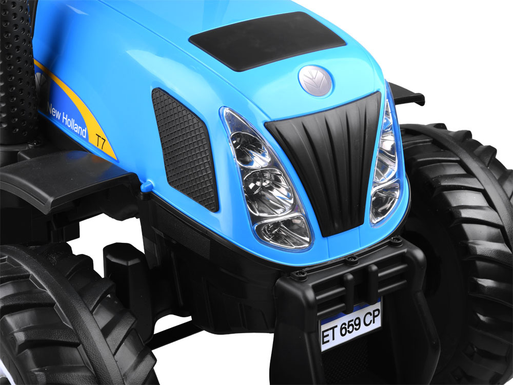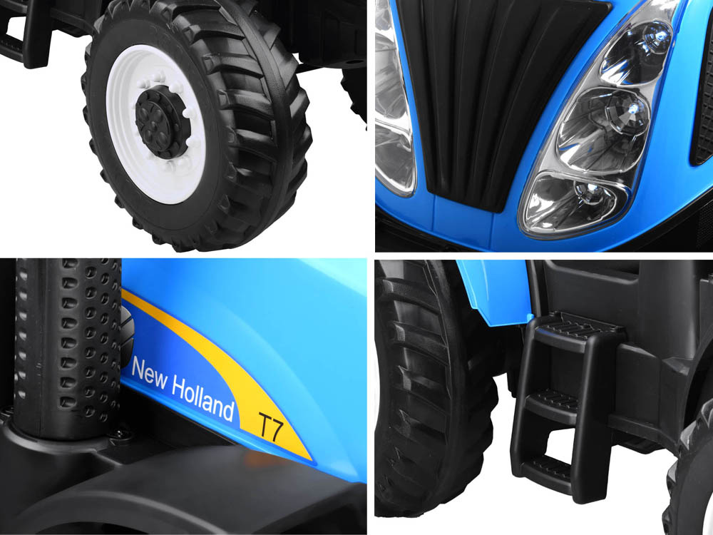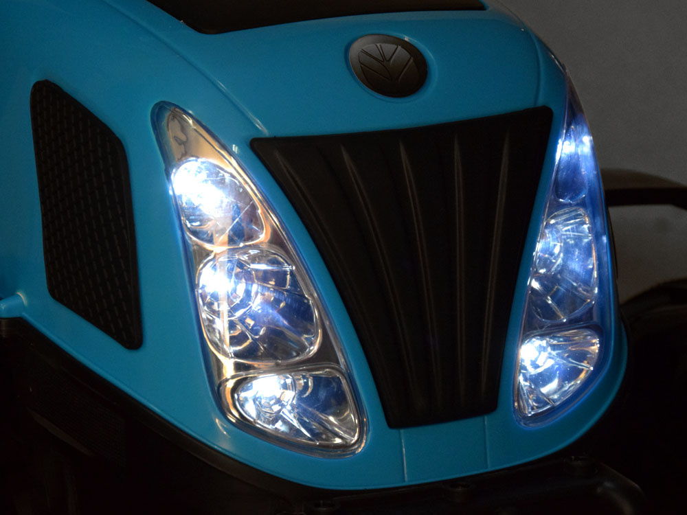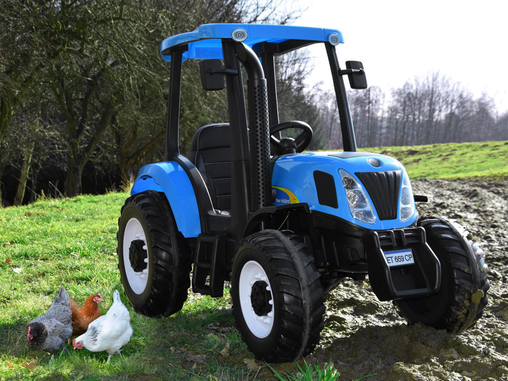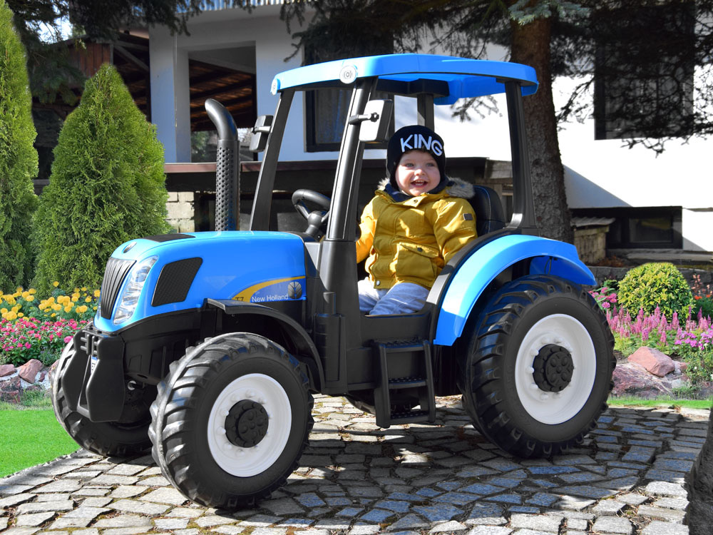 Derleistungsstarke batteriebetriebene New Holland Kindertraktor ist eine absolute Neuheit für jeden kleinen Landwirt. Das sehr realistisch gestaltete Fahrzeug wird jeden kleinen Fahrer zufrieden stellen. Im Traktor wurde auf einen bequemen, mit Öko-Leder gepolsterten Sitz mit Sicherheitsgurten, ein Lenkrad mit Hupentaste und ein Musikpaneel mit der Möglichkeit, ein eigenes Abspielgerät anzuschließen, geachtet. Der Traktor hat beleuchtete Lichter vorne und hinten und große EVA-Räder mit einem Profil für eine komfortable Fahrt.