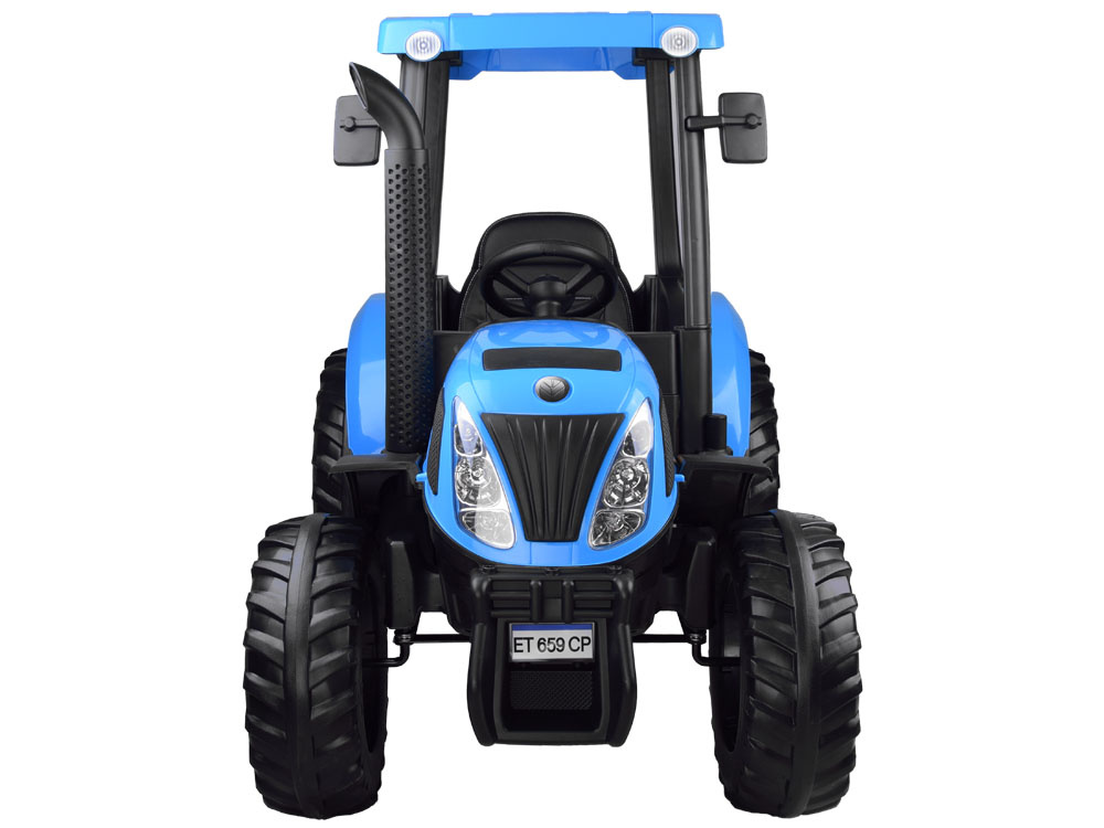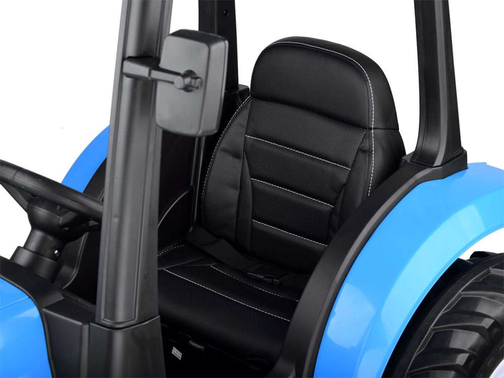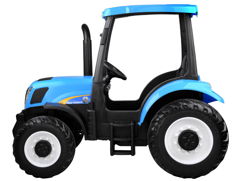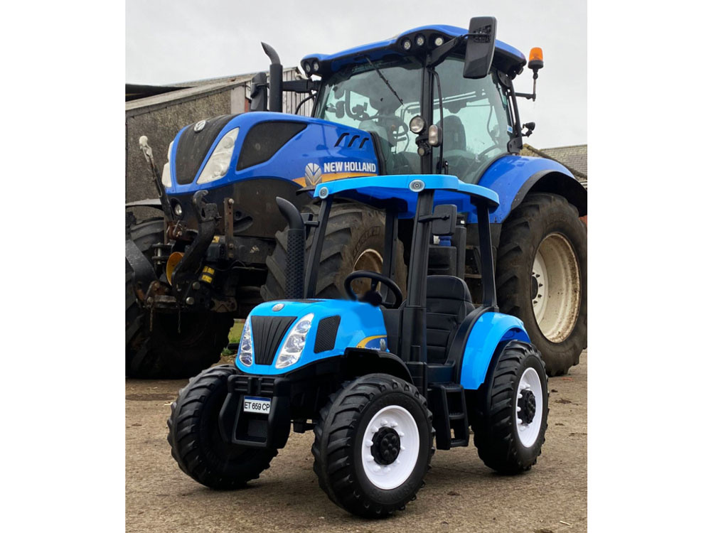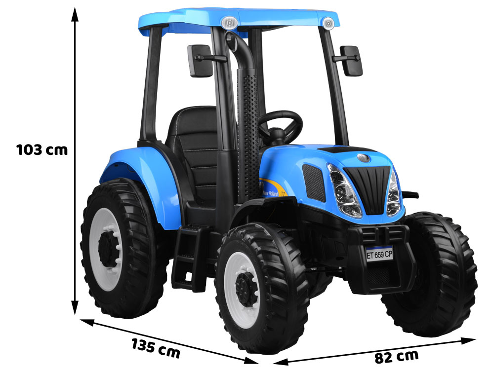 Derleistungsstarke batteriebetriebene New Holland Kindertraktor ist eine absolute Neuheit für jeden kleinen Landwirt. Das sehr realistisch gestaltete Fahrzeug wird jeden kleinen Fahrer zufrieden stellen. Im Traktor wurde auf einen bequemen, mit Öko-Leder gepolsterten Sitz mit Sicherheitsgurten, ein Lenkrad mit Hupentaste und ein Musikpaneel mit der Möglichkeit, ein eigenes Abspielgerät anzuschließen, geachtet. Der Traktor hat beleuchtete Lichter vorne und hinten und große EVA-Räder mit einem Profil für eine komfortable Fahrt.