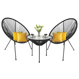 Zestaw mebli ogrodowych składający się z 2 foteli oraz stolika. Meble wytrzymałe na warunki atmosferyczne o nowoczesnym designie będą stanowić świetną ozdobę każdego tarasu/ogrodu/balkonu. Cechy produktu: - materiał wykonania: metal, szkło oraz polirattan - wymiary stolika: wysokość 51cm, średnica szklanego blatu: 50cm - wymiary fotela: wysokość 91cm, szerokość 72cm, głębokość siedziska 40cm - szklany blat mocowany na przyssawki W zestawie: - stolik ze szklanym blatem - 2 fotele waga: 19kg wymiary kartonu: 93x76x43cm Wysyłka możliwa dla ilości: paleta: 4szt.