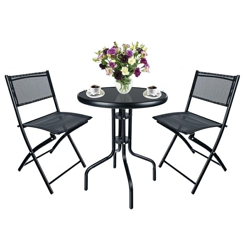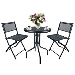 Zestaw mebli ogrodowych składający się z 2 krzeseł oraz stolika. Meble wytrzymałe na warunki atmosferyczne o nowoczesnym designie będą stanowić świetną ozdobę każdego tarasu/ogrodu/balkonu. Cechy produktu: - materiał wykonania: stal, szkło oraz polirattan - maksymalny udźwig krzesła: 100kg - podkładki wykonanne z PCV - Wymiary krzesła: wysokość: 81cm szerokość: 46cm wymiary siedziska (szer x gł): 42x38cm wys. od ziemi do siedziska: 48cm wymiar pojedynczego krzesła po złożeniu (wys x szer x gł): 92x45,5x9,5 cm - Wymiary stolika: średnica blatu: 60cm wysokość: 71cm W zestawie: - stolik ze szklanym blatem - 2 krzesła wymiary kartonu: 95,5x65,5x19cm Ilość szt. na palecie: 14