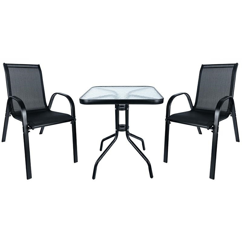 Zestaw mebli ogrodowych składający się z 2 krzeseł oraz stolika. Meble wytrzymałe na warunki atmosferyczne o nowoczesnym designie będą stanowić świetną ozdobę każdego tarasu/ogrodu/balkonu. Cechy produktu: Materiał wykonania: stal, szkło oraz polirattan (podkładki PCV) Wymiary krzesła: (szer x gł x wys)51,5 cm x 68 cm x 84 cm Wymiary stolika (dł./szer./wys.): 60x60x65cm Maksymalne obciążenie krzesła 120 kg Maksymalne obciążenie stolika 50 kg W zestawie: stolik ze szklanym blatem 2 krzesła wymiary opakowania: 77x70x13cm Ilość szt. na palecie: 23