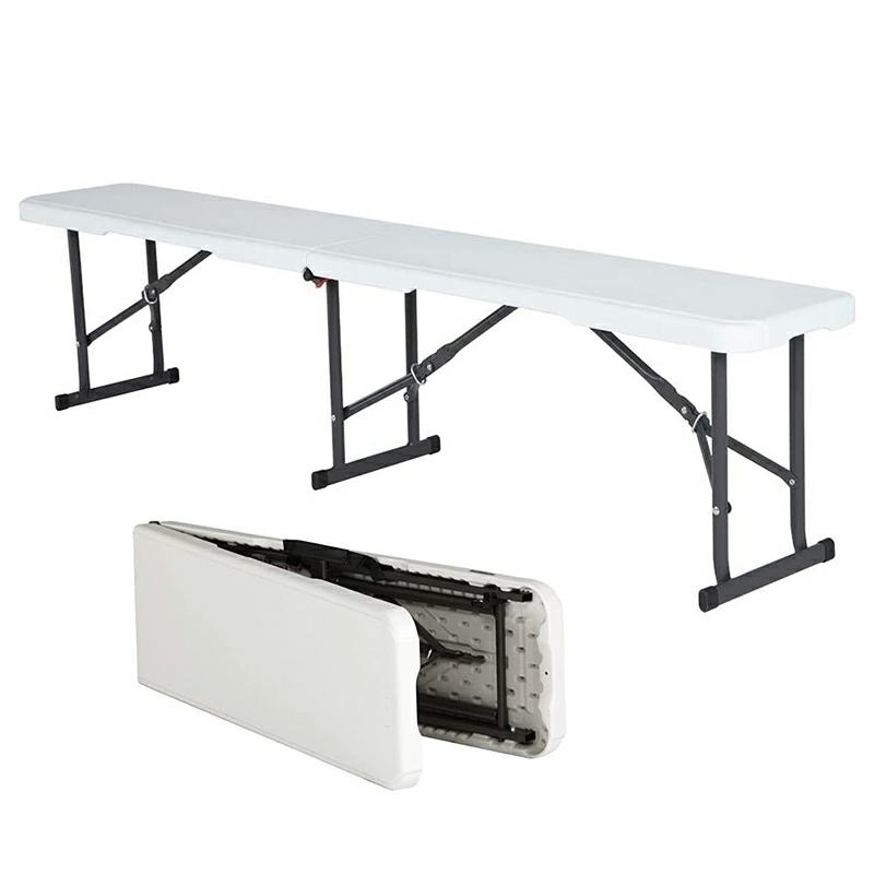 Ławka składana walizkowa do zastosowania m.in: w salach bankietowych, restauracjach, barach szybkiej obsługi, domach weselnych. Idealnie sprawdzi się również na pikniki, do ogrodu lub tarasu. Specyfikacja: - wymiary po rozłożeniu: 183x28x43cm - wymiary po złożeniu: 93x28x8cm - mocna i sztywna konstrukcja - materiał wykonania: stalowa konstrukcja malowana proszkowo i tworzywo HDPDE - maks. obciążenie: 180kg - grubość blatu: 4cm wymiary opakowania: 100x34x10cm Ilość szt. na palecie: 54