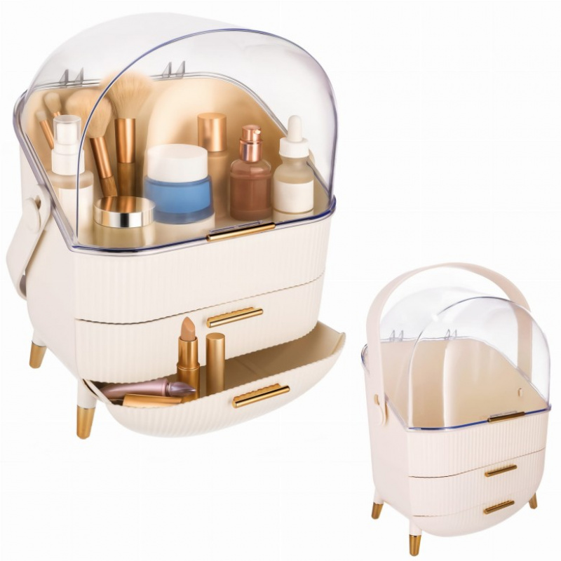 Wielopoziomowa konstrukcja – górna część z miejscem na butelki + dolne szufladki na drobiazgi Otwierana góra – łatwy dostęp do kosmetyków Uniwersalny design – świetnie pasuje zarówno do łazienki, jak i na elegancką toaletkę Oszczędność miejsca – kompaktowy, ale pojemny Odporność na wilgoć – idealny do użytku w łazience Trwałe tworzywo – solidny plastik, łatwy w czyszczeniu Estetyczne wykończenie – świetnie się prezentuje i eksponuje kosmetyki