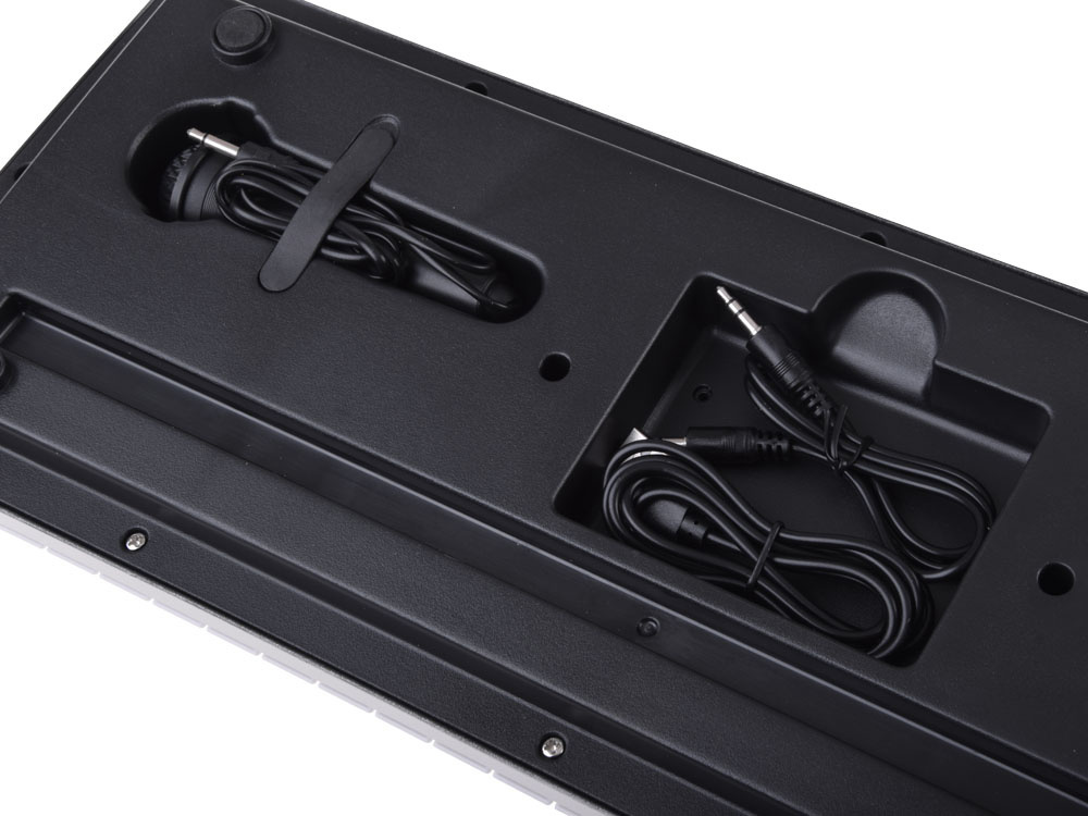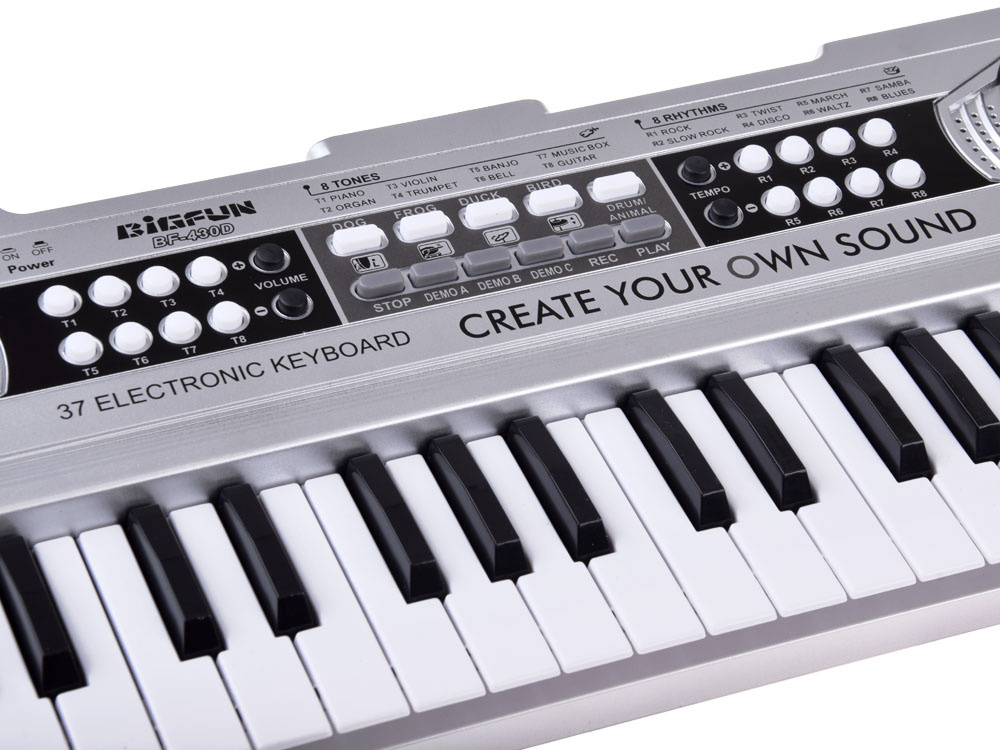 Keyboard posiada 37 klawiszy i aż 8 tonacji, dzięki czemu można spróbować różnych skal muzycznych. Do tego dochodzi 8 rytmów akompaniamentu – od spokojniejszych, klasycznych po bardziej dynamiczne, idealne do zabawy w mały koncert.