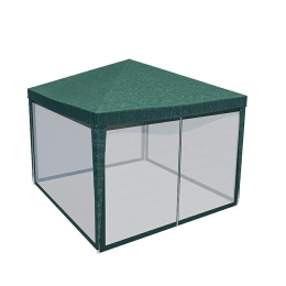 Pawilon ogrodowy z wytrzymałego polietylenu. Prosty w montażu. Odpowiedniej wytrzymałości elementy konstrukcyjne (średnica rurek - 2,4 cm, 1,8 cm) warunkują o stabilności pawilonu. Konstrukcja wykonana ze stali lakierowanej na kolor biały metodą proszkową. Odpowiedni podczas imprez plenerowych. Chroni przed słońcem, a w połączeniu z moskitierą - przed owadami. Dane techniczne: - materiał: PE 100 g/m2 - mocowanie poszycia do stelażu za pomocą rzepów - wymiary całkowite: długość ok 3m, szerokość ok 3m, wysokość w najwyższym punkcie ok. 2,5m - wysokość wejściowa: 1,75m - wymiary moskitiery: 2,65x1,67m - stelaż: średnica 2,4cm i 1,8cm - kolor: zielony W zestawie: - kompletny pawilon, stelaż, zestaw mocujący (linki + kotwy) - instrukcja montażu PL Wymiar kartonu: 109x16x20 cm ilość na palecie: 36 szt.