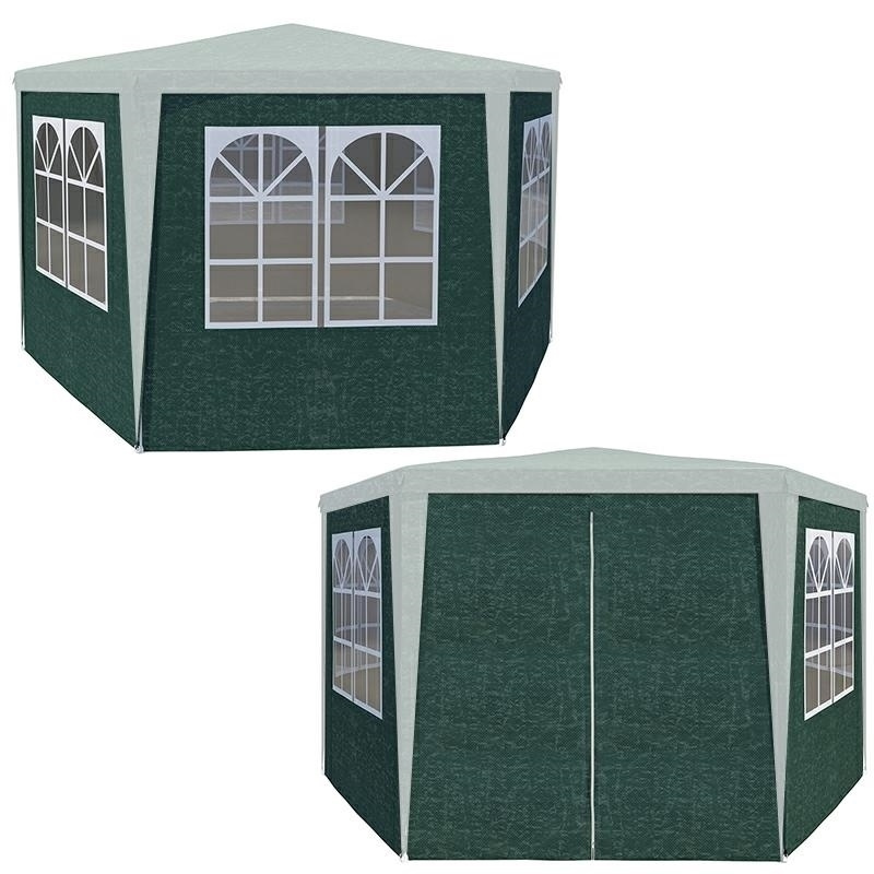 6 ścianek do pawilonów ogrodowych szcześciokątnych 2x2x2 m, zapinane na rzepy. Szybki montaż/demontaż. Cechy produktu: - 5 ścian z oknami - 1 ściana z suwakiem - ściany montowane do stelaża za pomocą rzepów - wymiary całkowite: szerokość ściany ok. 2m, wysokość w najwyższym punkcie 2,5 m, średnica ok. 4m - materiał: PE 100g/m2 wodoodporny - kolor: zielony - ochrona przed słońcem i deszczem Dane techniczne: - wymiary całkowite ścianek: szerokość ok 200 cm, wysokość ok 200 cm - wymiary całkowite okna: szerokość 115 cm, wysokość 100 cm - wymiary pojedynczego okienka: szerokość 58 cm, wysokość: 100 cm Pasuje do pawilonow ogrodowych o wymiarach konstrukcji ok 2x2x2m. Dedykowany do pawilonu PA6. Produkt zapakowany w foliopak gotowy do wysyłki.