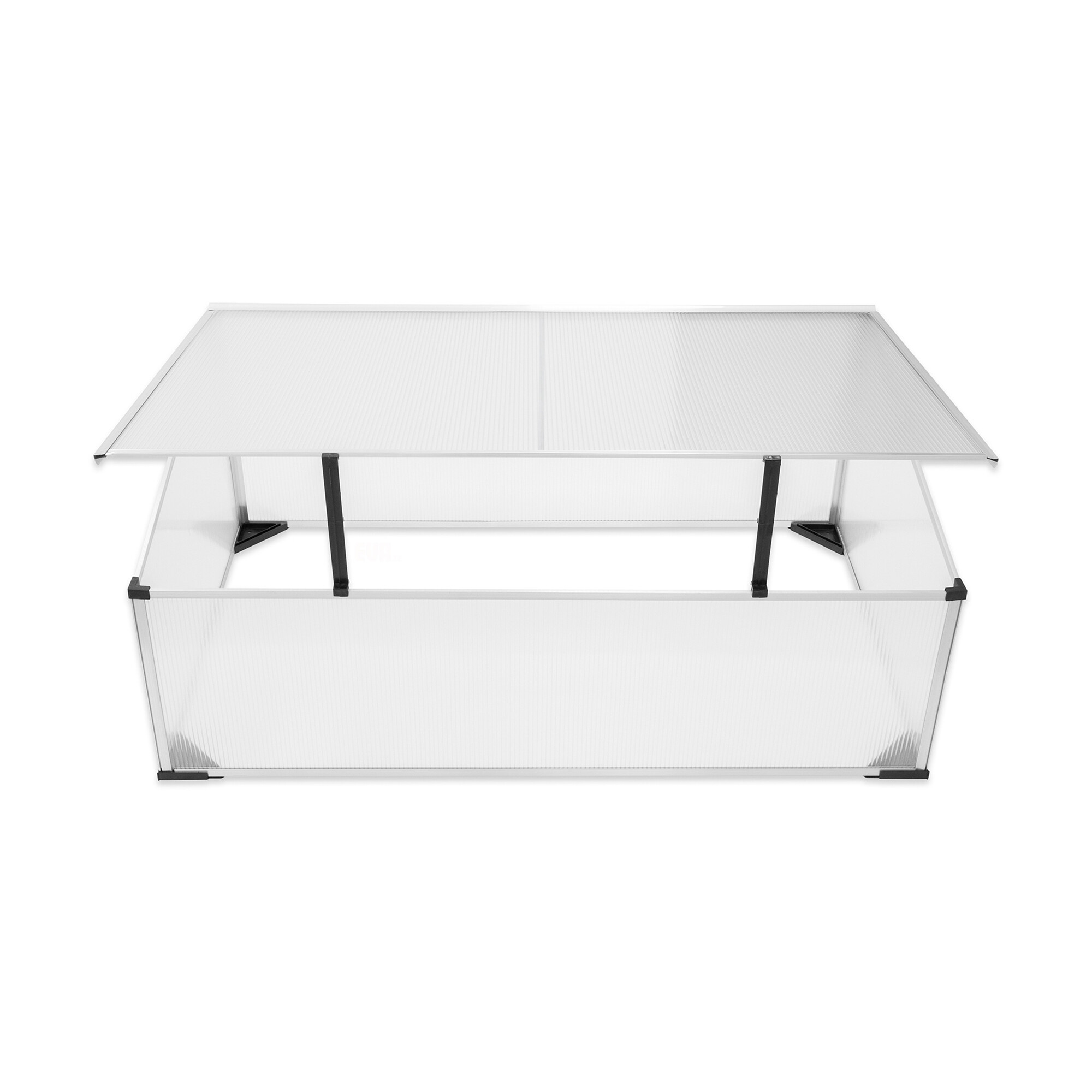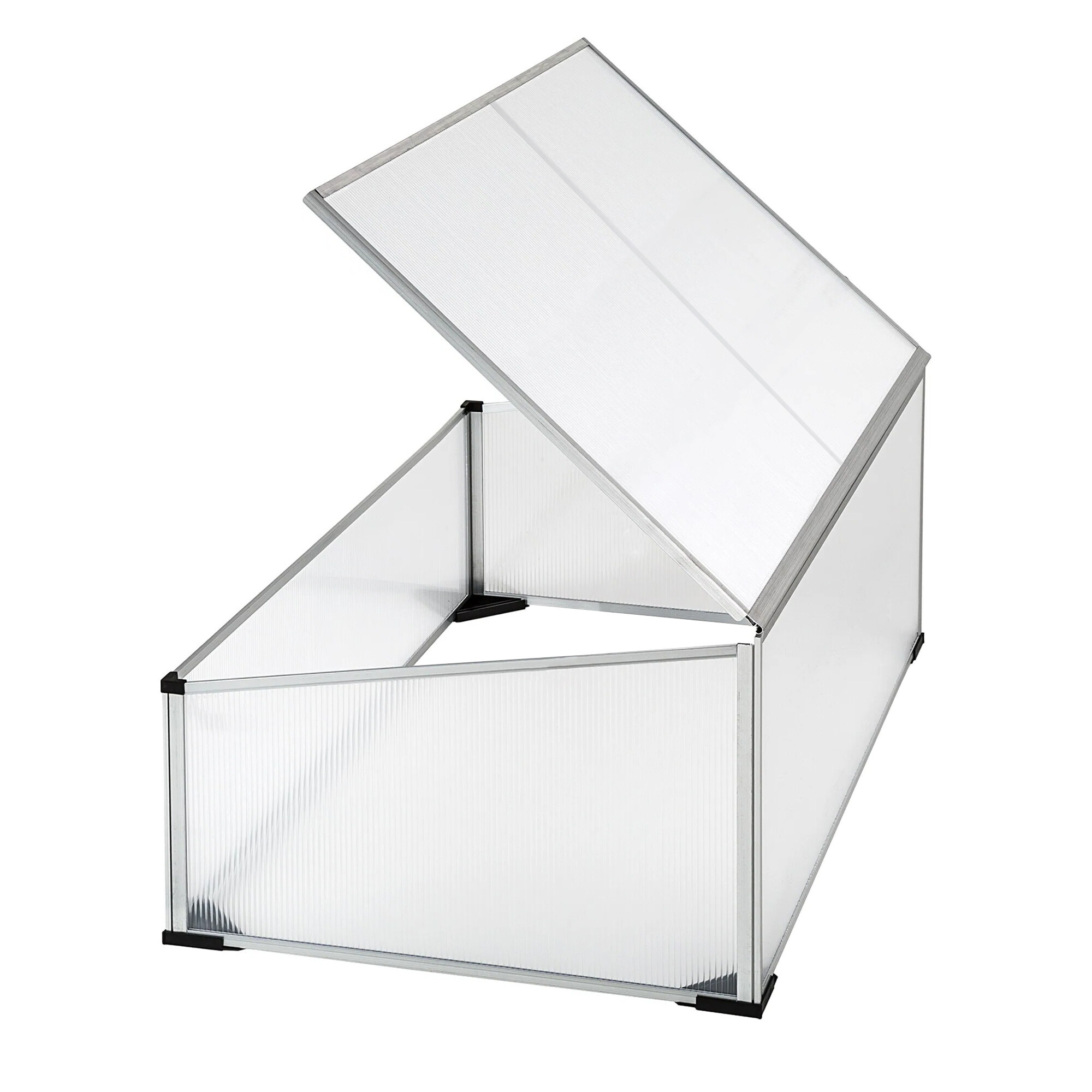 Garten Frühbeet mit hervorragenden Wärmedämmeigenschaften, hergestellt aus Aluminiumprofilen mit Polycarbonatfüllung.Das Frühbeet ist mit einer aufklappbaren oberen Platte für bequemen Zugang und Belüftung ausgestattet.