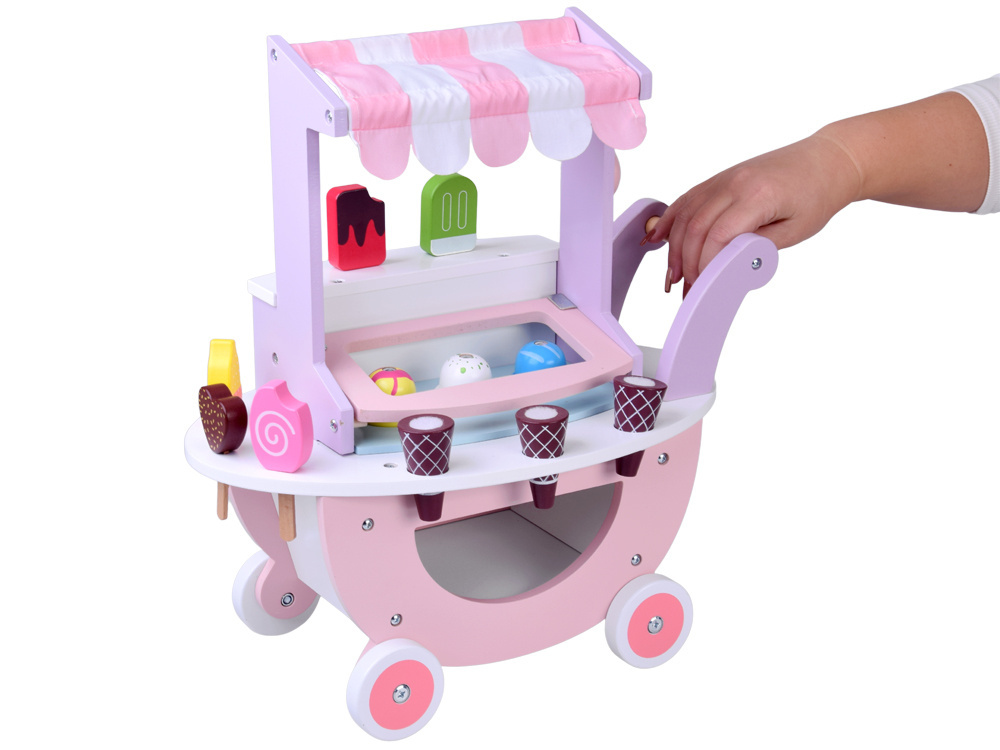 Dzięki drewnianej rączce wózek można łatwo ciągnąć lub pchać, co pozwala bawić się w mobilną lodziarnię w dowolnym miejscu.