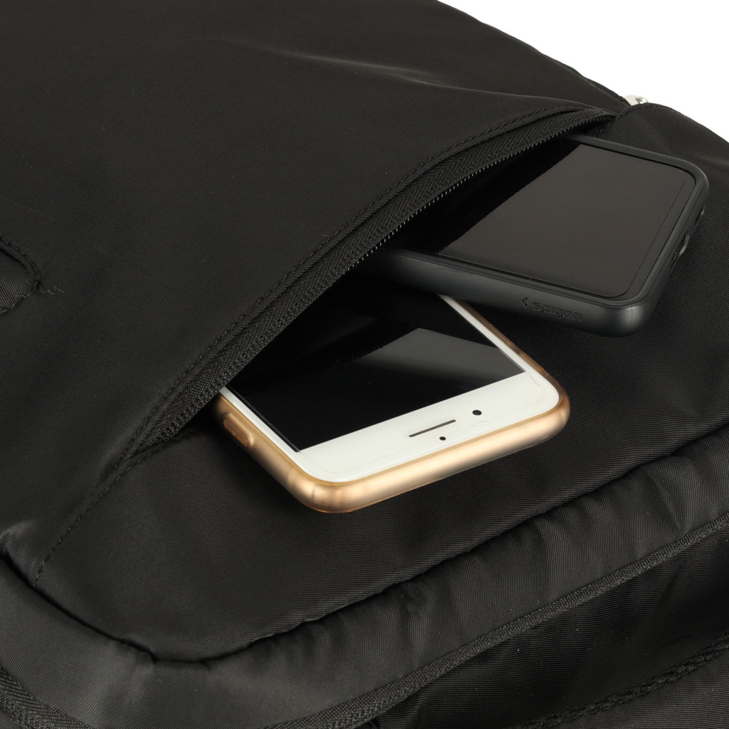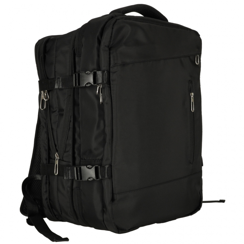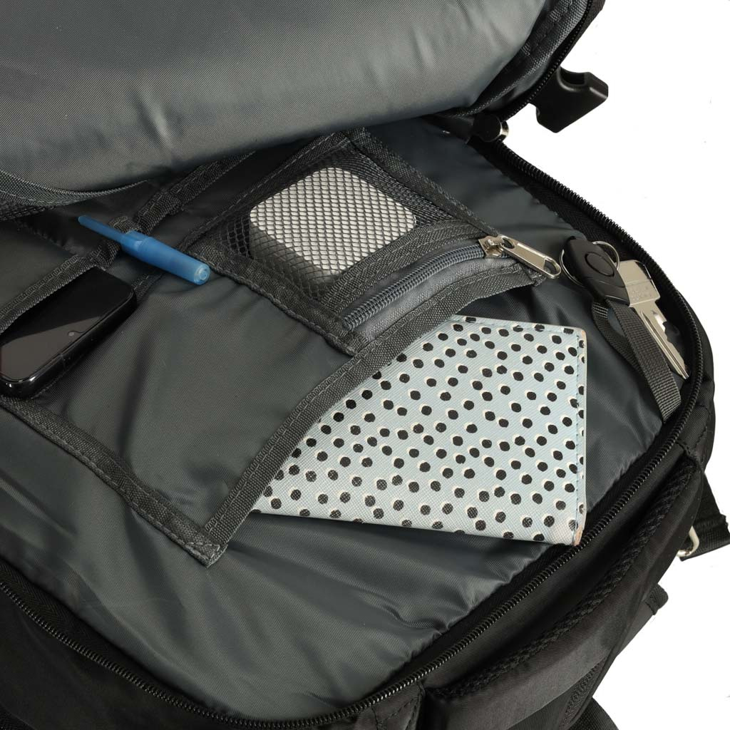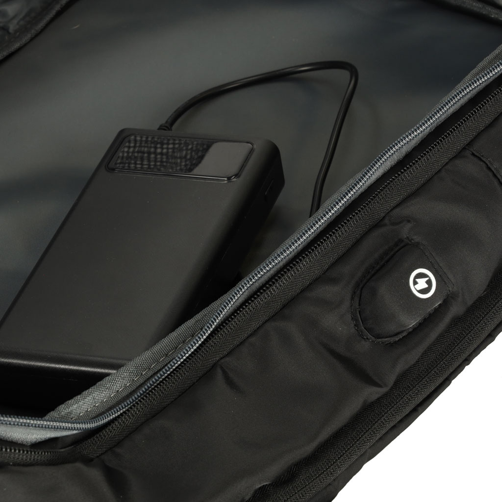 Schwarzer Travel Backpack - Ihr Begleiter in jeder Situation: unterwegs, auf Reisen, aber auch auf dem Weg zur Arbeit oder zur Schule. Er ist sehr geräumig - ein Laptop oder Kleidung für ein paar Tage passen problemlos hinein. Sie hat drei Hauptfächer und mehrere Taschen für kleine Gegenstände. Sie ist mit einer USB-Buchse und einem USB-Kabel ausgestattet, mit denen Sie Ihr Telefon aufladen können, ohne die Powerbank abnehmen zu müssen.