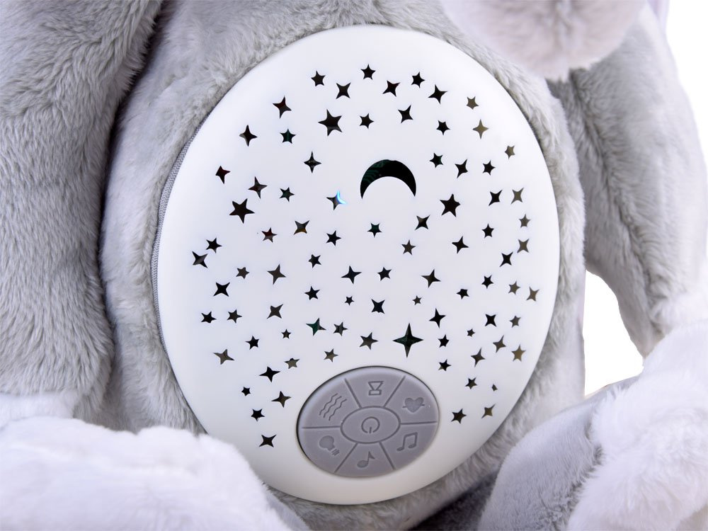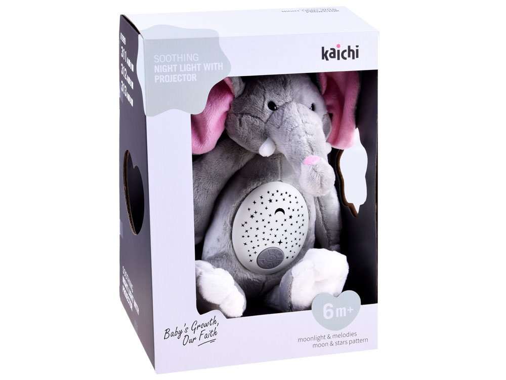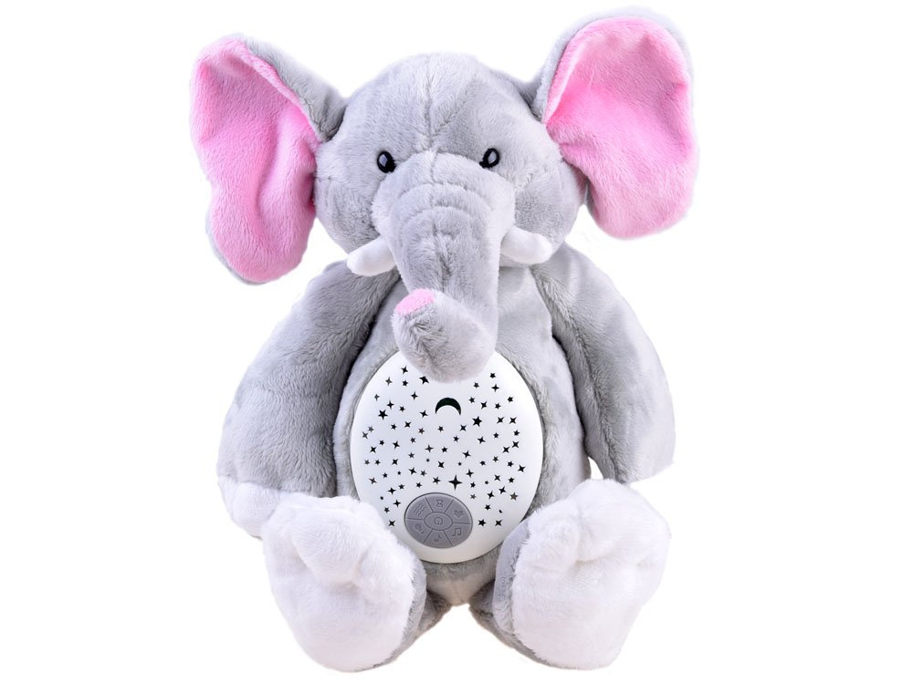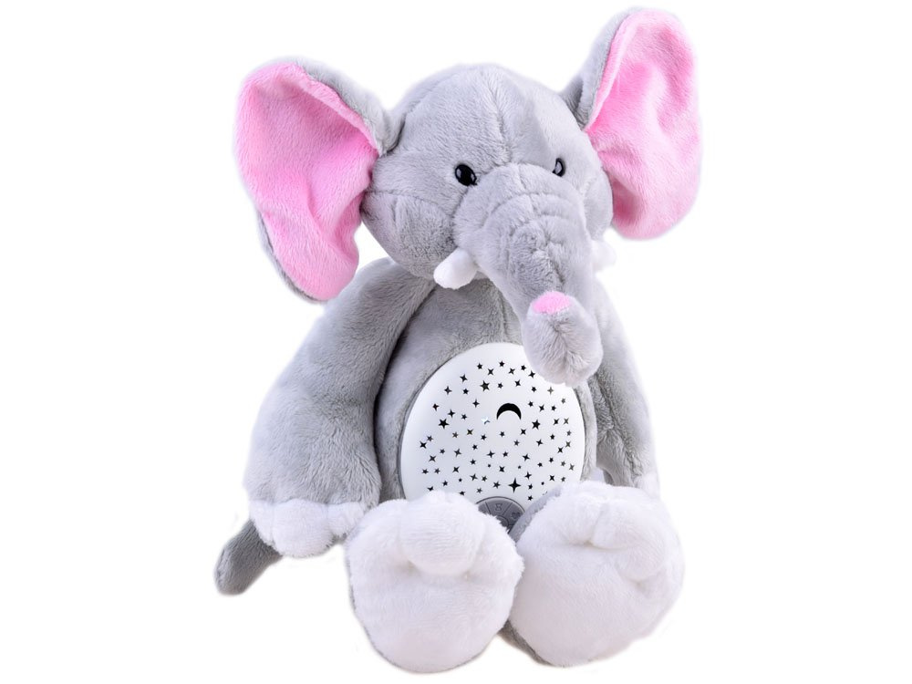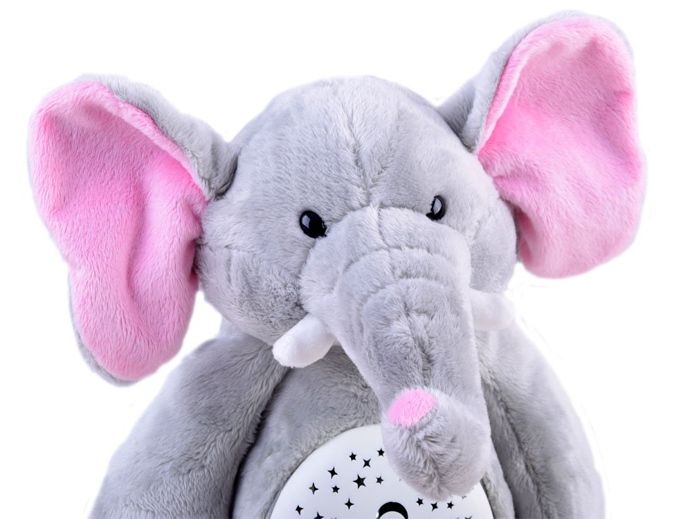 DerPlüschelefant mit Projektor und Soundeffekten ist für die Kleinsten in der Familie gedacht. Das Spielzeug ist aus weichem Plüsch in Grau mit rosa Ohren.