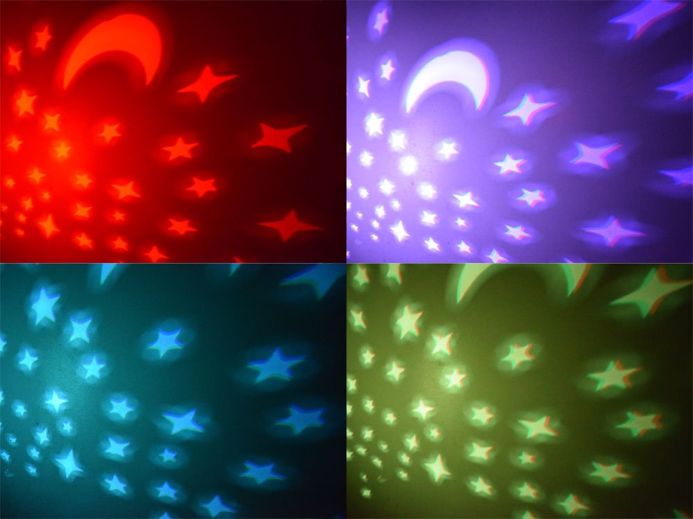- lichteffekte: Der Projektor zeigt sanftes Licht mit Sternen- und Mondkonstellationen. Das Licht wechselt sanft die Farbe (blau, violett, rot, gelb, grün), ein solcher Projektor ist ideal für das Einschlafen von Kleinkindern in der Nacht, um die Dämmerung zu durchbrechen.