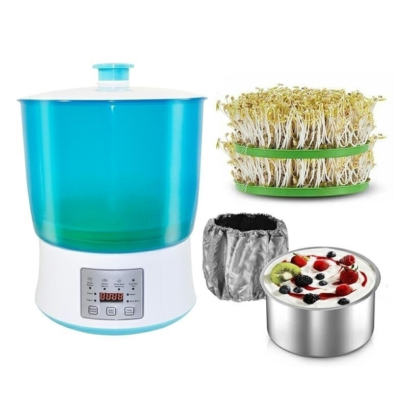 Automatyczna kiełkownica / urządzenie do hodowania kiełków, produkcji wina ryżowego, jogurtu. Urządzenie zapewnia idealne warunki do kiełkowania, nawadnia oraz utrzymuje odpowiednią temperaturę. Specyfikacja: 8 trybów pracy (4 tryby kiełkowania, tryb produkcji jogurtu, tryb produkcji wina ryżowego, tryb Natto, tryb czyszczenia) Zasilanie: 230V 50Hz Moc: 20W Wbudowana grzałka zapewniająca odpowiednią do wybranego trybu pracy temperaturę 2 szalki do kiełkowania średnica: 26cm wysokość: 34cm Ilość szt. w kartonie: 8 Ilość szt. na palecie: 48