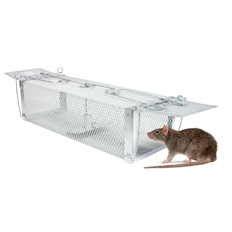 Pułapka na kuny, szczury itp. w formie klatki - nie zabija gryzoni lecz zamyka je w klatce z możliwością późniejszego wypuszczenia na zewnątrz. Wystarczy umieścić wewnątrz pułapki przynętę i następnie monitorować co jakiś czas czy w pułapkę złapał się szkodnik. Specyfikacja: prosta i skuteczna konstrukcja wielorazowego użytku pułapka nie zabija zwierząt - można je później wypuścić szczur po wejściu do środka nie może wyjść sam na zewnątrz pułapka wykonana z wytrzymałej siatki odpornej na przegryzienia wymiary otworów wejściowych: 12x9cm wymiary: 60x15x12cm (z otwartymi klapami) wymiary opakowania: 44,5x17x13,5cm Ilość szt. na palecie: 128