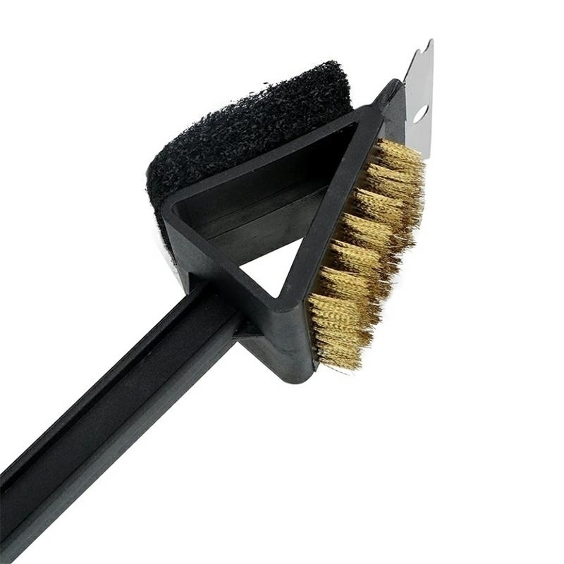 Szczotka czyszcząca do grilla 3w1 o długości 36cm wykonana z najwyższej jakości materiałów. Pozwala wyczyścić ruszt oraz pozostałe elementy grilla z sadzy, tłuszczu oraz innych zabrudzeń powstałych podczas eksploatacji. Specyfikacja: - długość: 36cm - uchwyt z wytrzymałego tworzywa sztucznego - 3 funkcje: 1)ostra skrobaczka do usuwania uporczywych zabrudzeń 2)szczotka z drutu miedzianego do czyszczenia powierzchni odpornych na zarysowania 3)miękka nylonowa gąbka do czyszczenia delikatnych powierzchni, np. teflonu Ilość szt. w kartonie: 50 Ilość szt. na palecie: 312