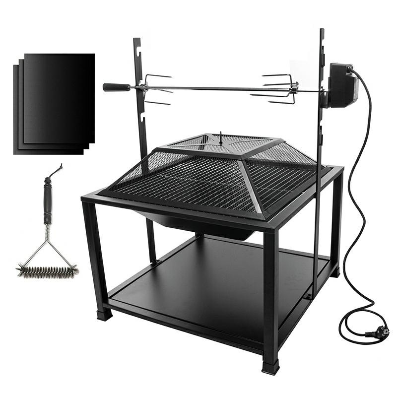 Grill ogrodowy / palenisko z rożnem elektrycznym i pokrywą. Grill wykonany został ze stali malowanej proszkowo. Dzięki elektrycznemu napędowi rożna, grillowanie potraw będzie przyjemnością nie wymagającą Specyfikacja: Zasilanie rożna elektrycznego: 220-240V 50/60Hz Moc: 4W Prędkośc obrotowa rożna: 2 obr./min Długość przewodu zasilającego: 150cm Wymiary całkowite (z zainstalowanym rożnem): 63x89x88cm Duża półka 56x56cm pod paleniskiem Wymiary rusztu węglowego: 34x34cm Wymiary głównego rusztu: 55x55cm Pokrywa paleniska wykonana ze stalowej siatki 3 stopnie regulacji wysokości rożna (17,5cm, 29cm, 40cm od paleniska) Regulowany rozstaw szpikulców na rożnie (maks. szerokość 57,5cm) W zestawie: grill druciana szczotka do mycia rusztu 3 maty teflonowe do pieczenia Wymiary opakowania: 66x66x18cm Ilość szt. na palecie: 20