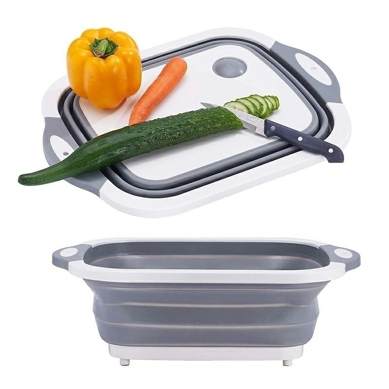 Składana silikonowa miska z deską do krojenia. Aby skorzystać z deski do krojenia wystarczy złożyć silikonową miskę. Materiały, z których został wykonany produkt są bezpieczne dla zdrowia. Specyfikacja: materiał: silikon + wytrzymałe tworzywo sztuczne wymiary złożonej deski do krojenia: 38,5x28,5x2,5cm wymiary miski po rozłożeniu: 38,5x28,5x12cm głębokość rozłożonej miski: 10cm pojemność: ok. 11l korek do spuszczenia wody na spodzie miski