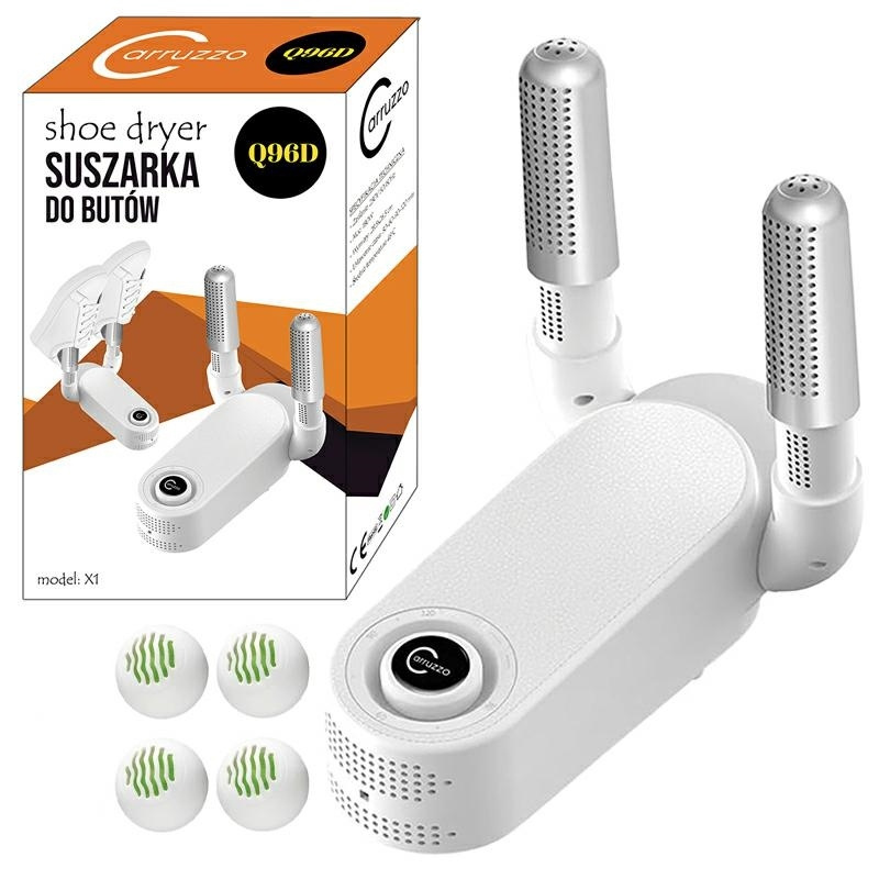 Korzystając z naszej suszarki pozbędziesz cieszyć się suchymi i pozbawionymi nieprzyjemnego zapachu butami przez okrągły rok. Obieg powietrza doskonale osusza obuwie oraz przyspiesza proces suszenia. Elegancki wygląd sprawia, że suszarka bez trudu znajdzie sobie nawet wyeksponowane miejsce w Twoim domu, a użycie trudnopalnych materiałów spowoduje, że jej używanie będzie nie tylko wyjątkowo efektywne, ale również skuteczne. Dzięki ustawianemu timerowi nie musisz pamiętać o jej wyłączeniu i możesz cieszyć się wygodnymi, pozbawionemu nieprzyjemnych zapachów butami. Dodatkową korzyścią będą zdrowsze stopy, bez względu na pogodę czy porę roku. Marka: Carruzzo Specyfikacja -Zasilanie: AC 220-240V - Moc: 180W - Temperatura powierzchni zewnętrznej w trakcie pracy: 48°C (±10°C) - Ustawienie czasu: 30-60-90-120min - Wymiary: 28,5x26,5x17,5cm Kulki odświeżające gratis Produkt zpakowany w dodatkowy karton. ilość na palecie 216 szt