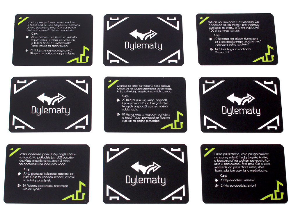 - Wybierana jest talia kart dylematów: zielona (lekkie), pomarańczowa (ciężkie) lub czerwona (najbardziej kontrowersyjne).