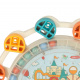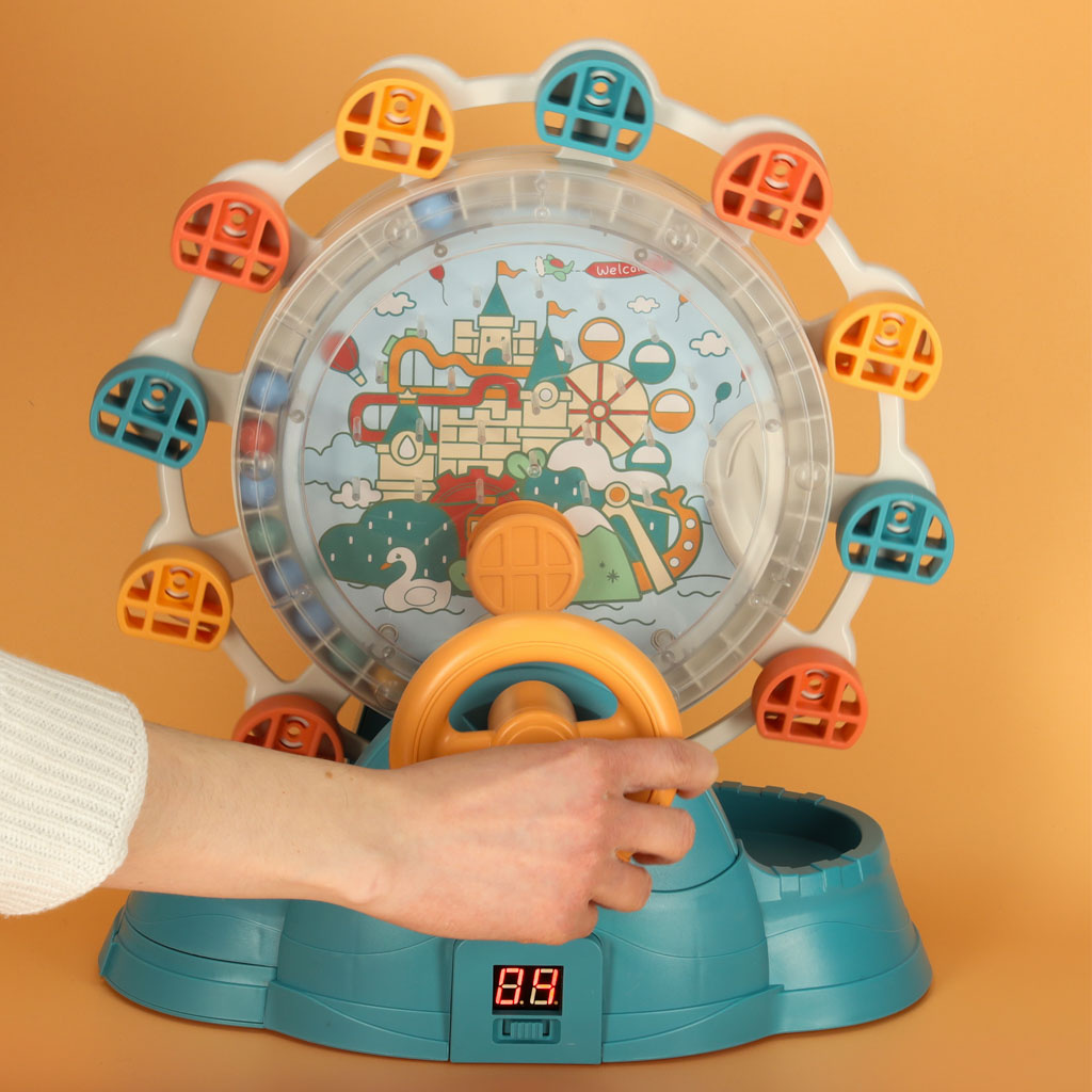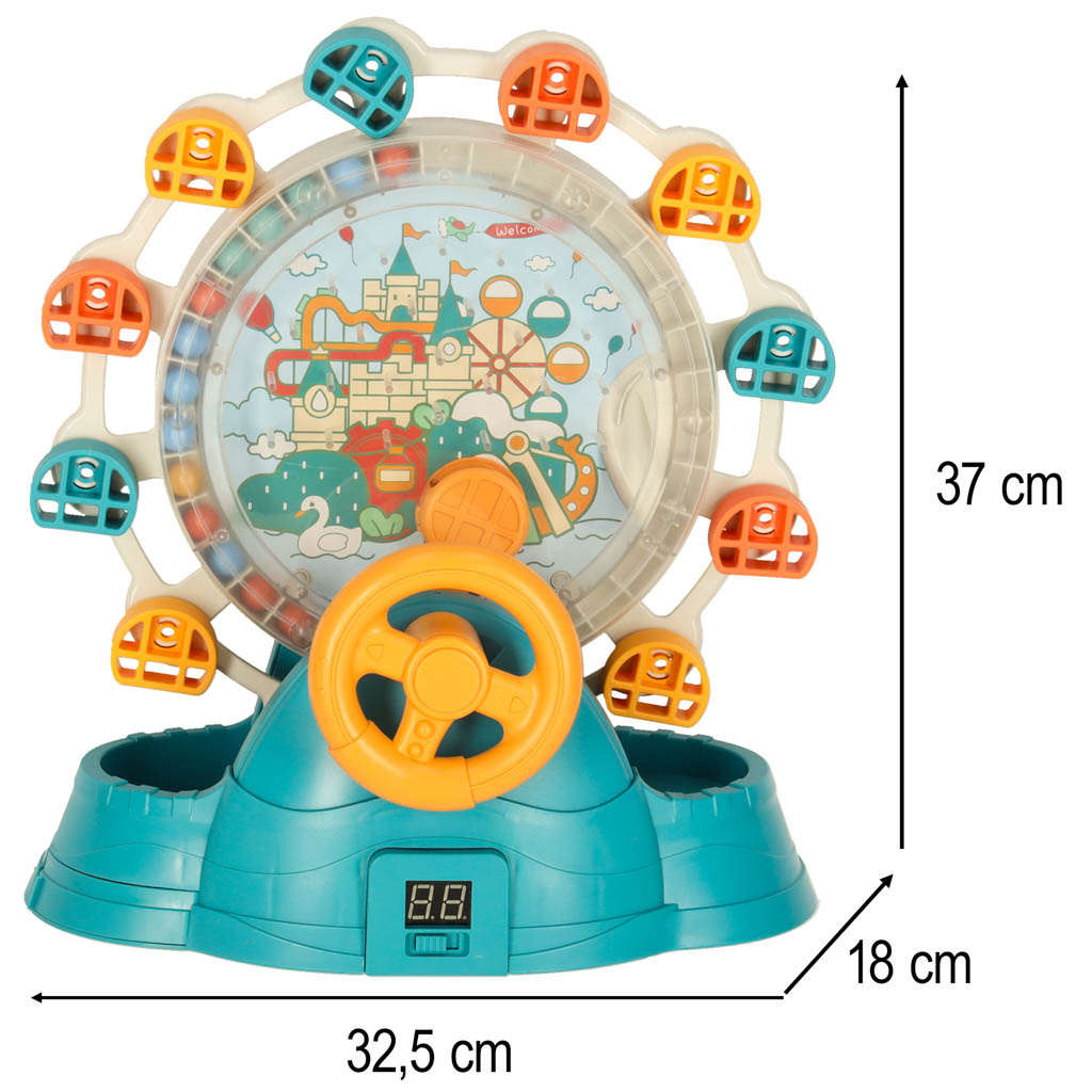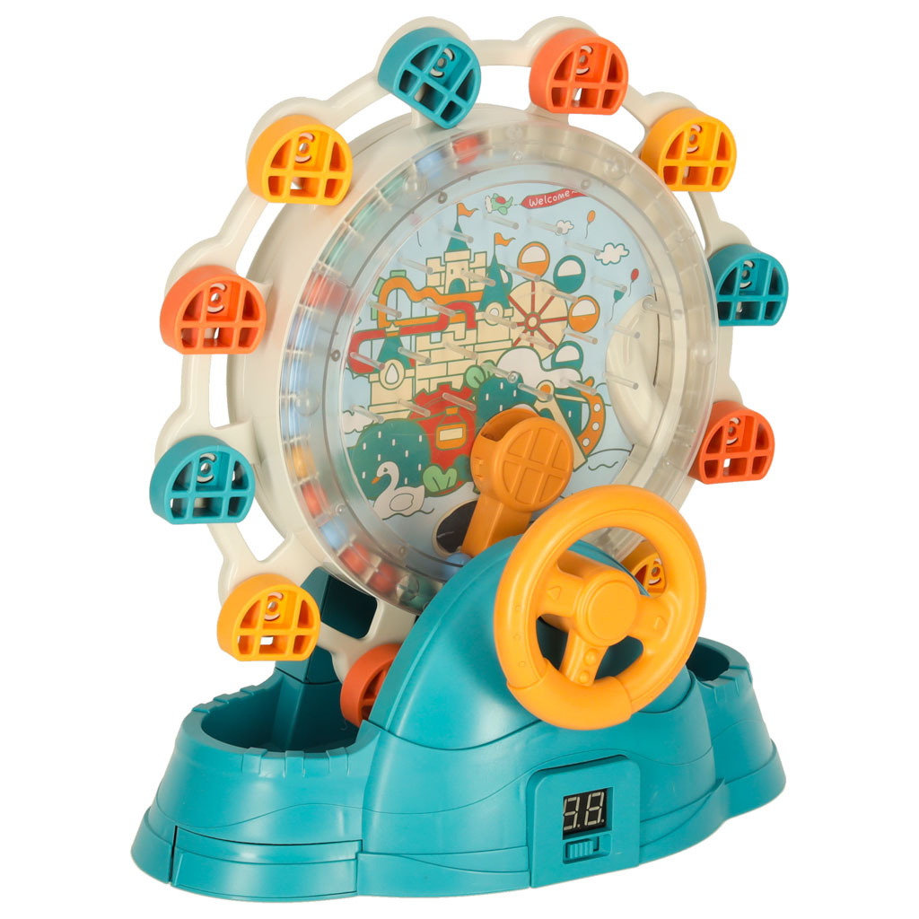 V této hračce jsou míčky v neustálém pohybu - zvedají se a spouštějí pomocí speciálního mechanismuna vypouštění míčků. Batole musí vystihnout okamžik a správným pohybem volantu nasměrovat nádobu tak, aby míček zapadl přesně do koše. Je to vynikající způsob, jak rozvíjet reflexy a učit se trpělivosti a soustředění.