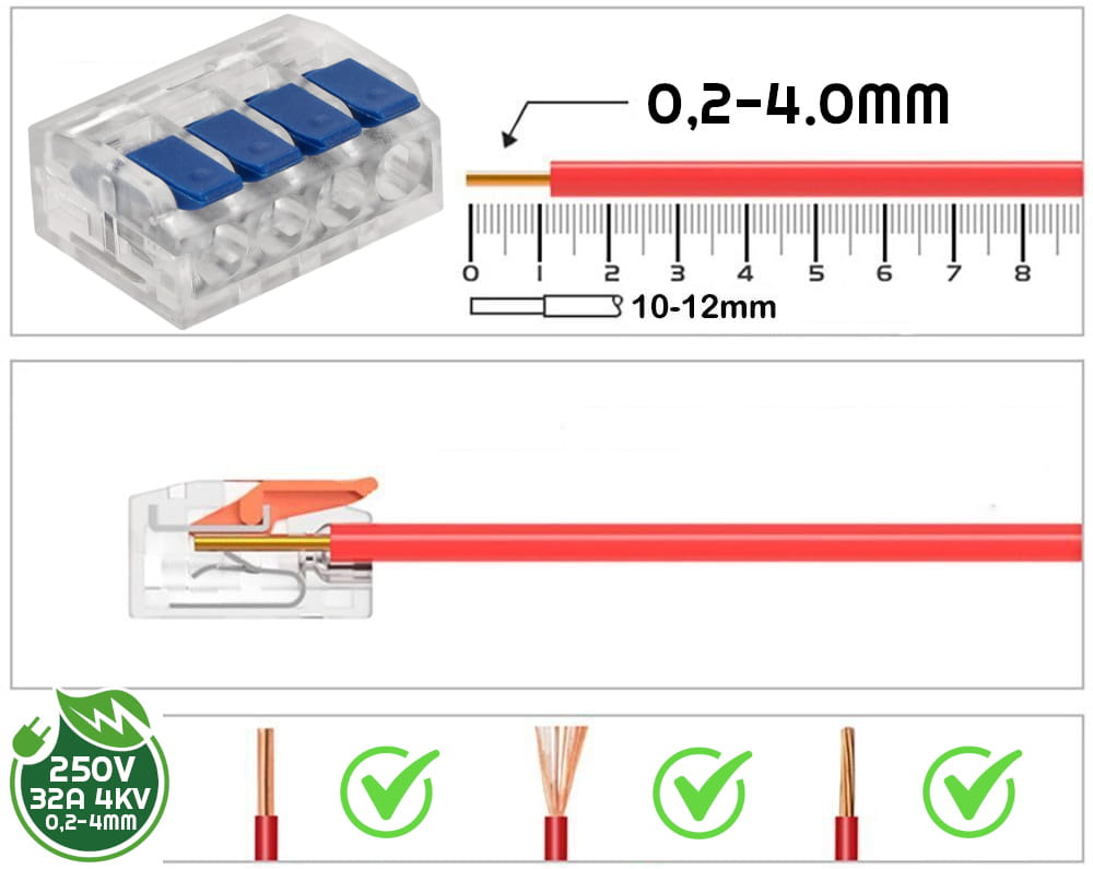 Elektrikáři, instalatéři, průmysloví dělníci Technické údaje: Instalace: svorka Počet vodičů: 4 Průřez vodiče: 0,2 - 4 mm² Napájecí napětí: 250V Proud: 32A Třída hořlavosti UL94 pouzdra: V0 Materiál kontaktu: Měď (100%) Pocínovaný Materiál pružiny: AS301 nerezová ocel Další vlastnosti : Pohodlné páky