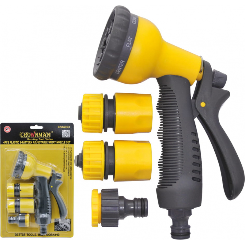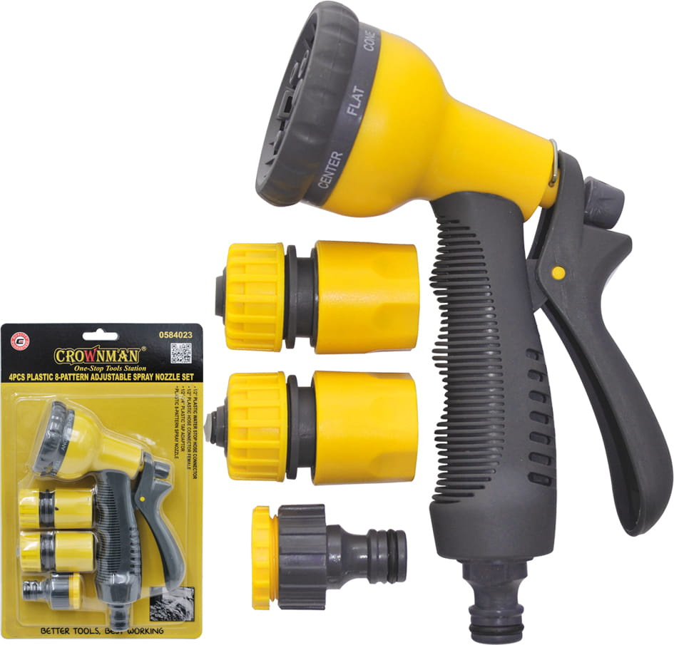 Montážní sada: Sada obsahuje 4 plastové hadicové koncovky včetně koncovky proti vodě, koncovky samice, adaptéru na kohoutek a nastavitelné stříkací pistole.