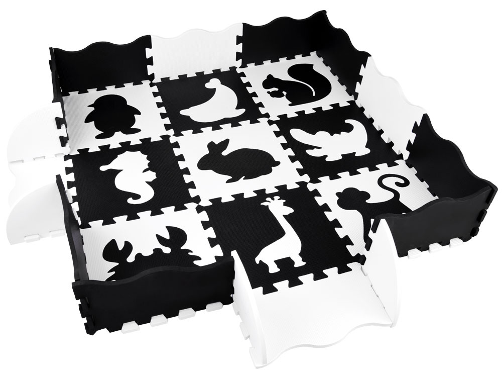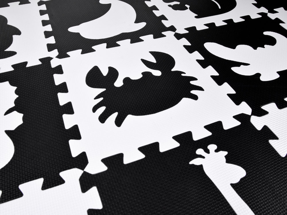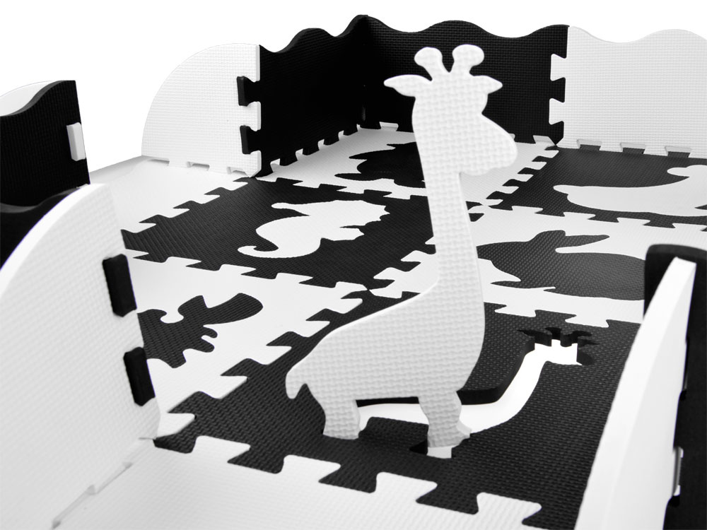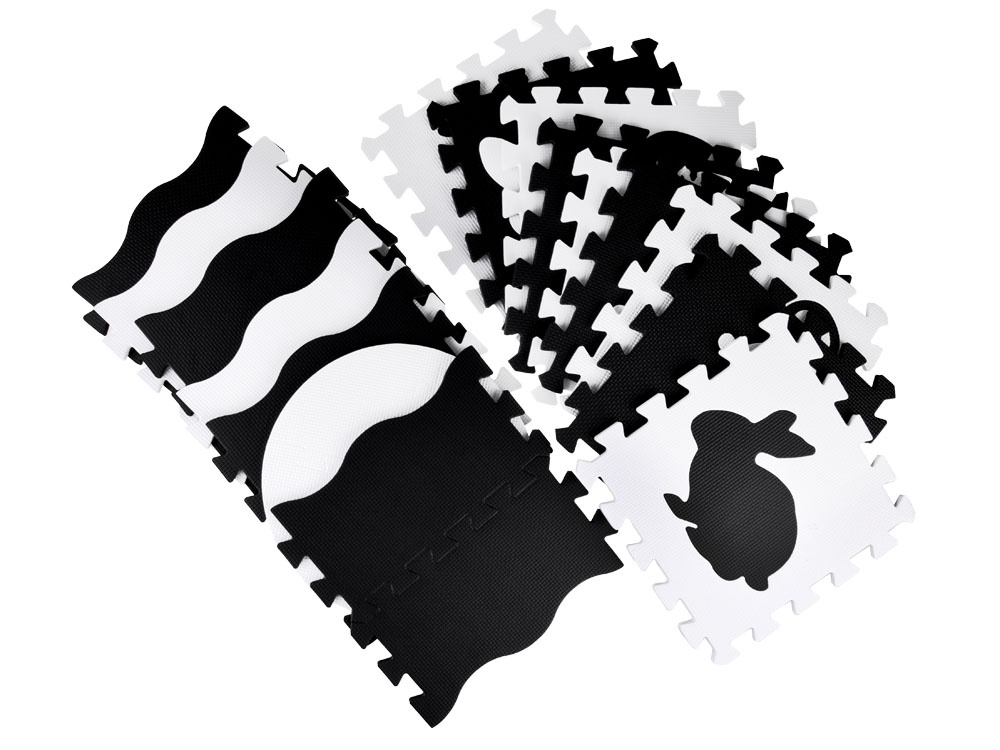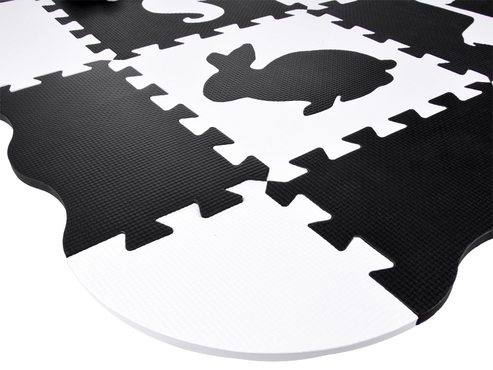 Schaumstoffmatte für Babys und Kinder aus weichen Puzzles in kontrastierenden Schwarz- und Weißtönen.Das Set enthält 16 Schaumstoffpuzzles. Dank seiner universellen Farbgestaltung passt er in jedes Kinderzimmer.