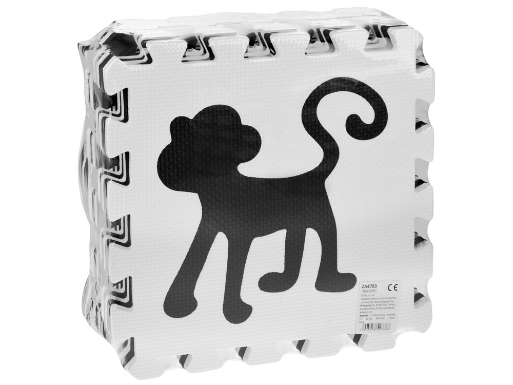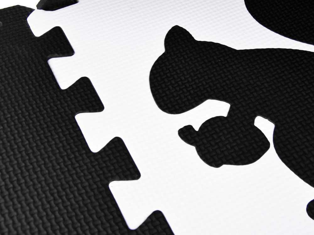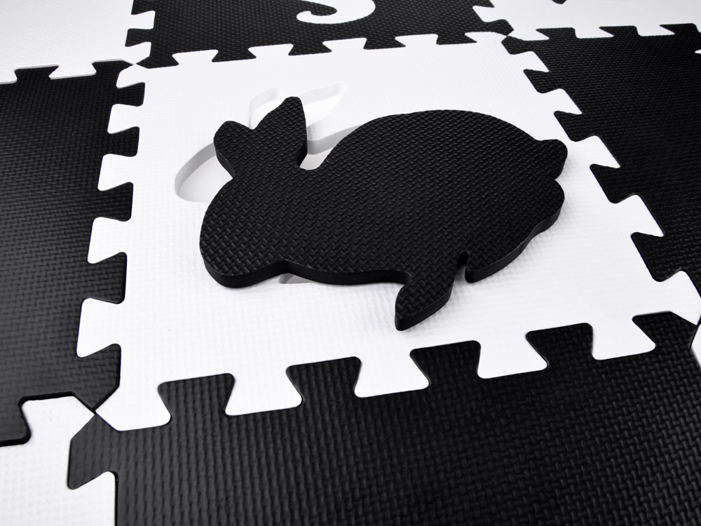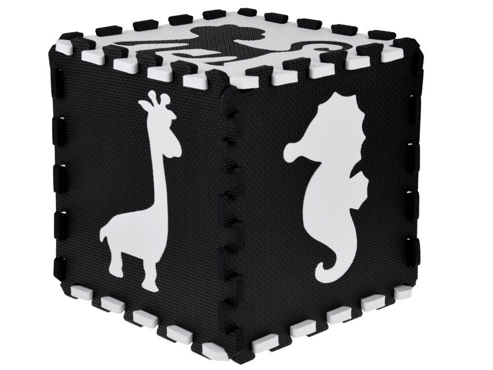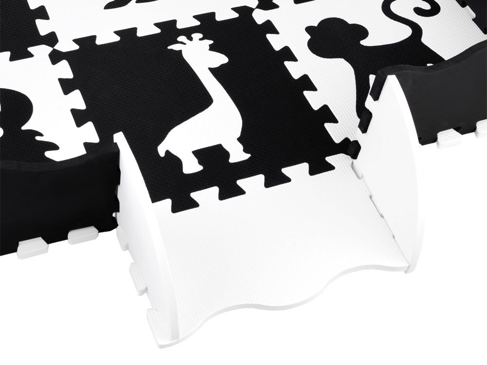 Schaumstoffmatte für Babys und Kinder aus weichen Puzzles in kontrastierenden Schwarz- und Weißtönen.Das Set enthält 16 Schaumstoffpuzzles. Dank seiner universellen Farbgestaltung passt er in jedes Kinderzimmer.