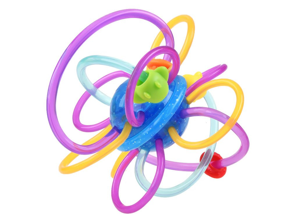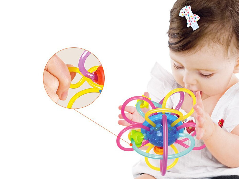 Dank der flexiblen Elemente kann Ihr Kind das Spielzeug problemlos in den Händen halten. Die glatte und weiche Oberfläche der flexiblen Rollen massiert perfekt das Zahnfleisch Ihres Babys. Bunte Perlen, die auf flexiblen Strudeln angebracht sind, gleiten leicht über das Spielzeug.