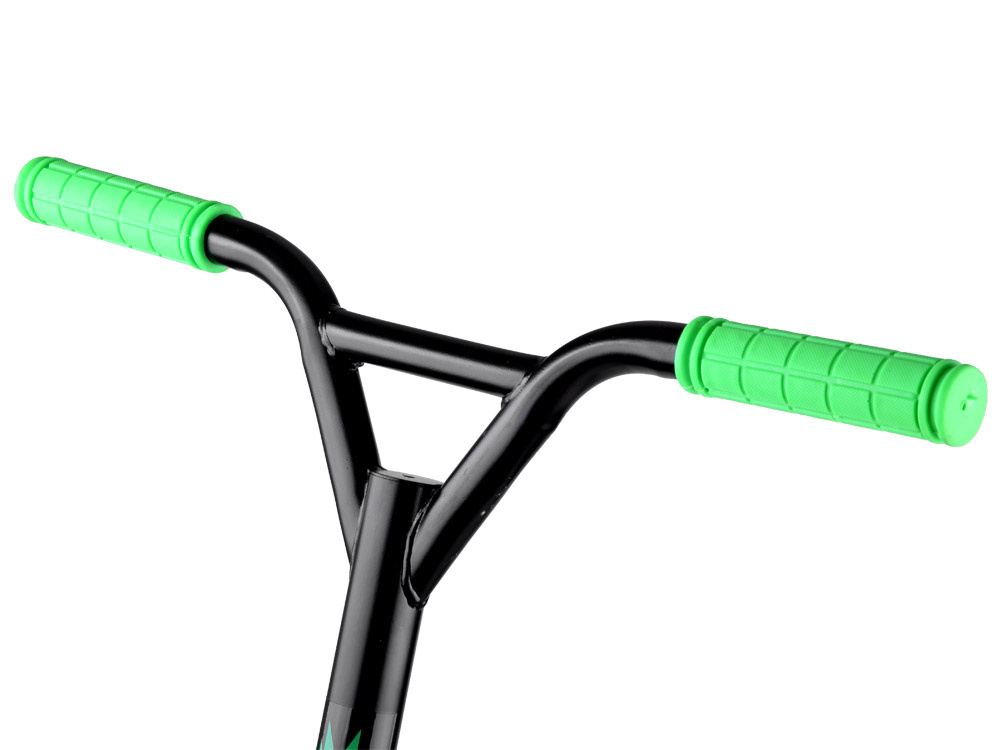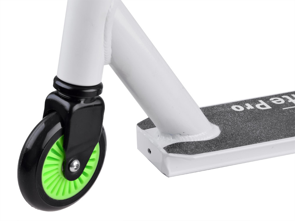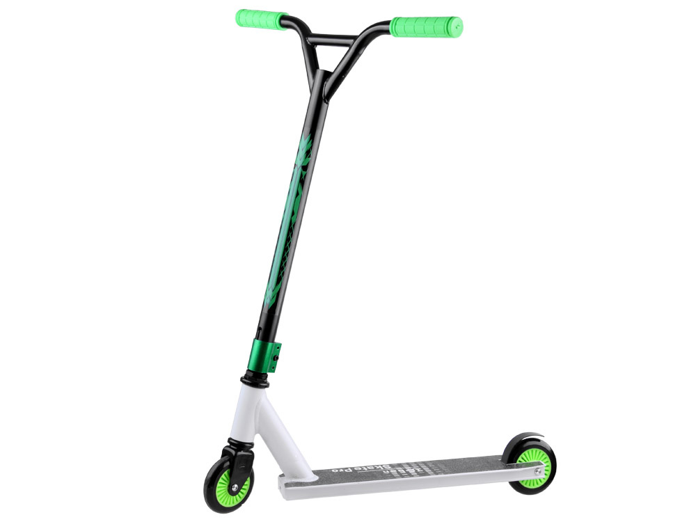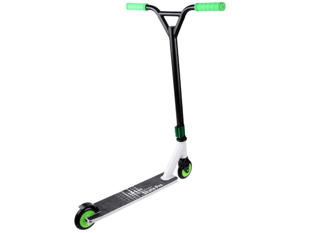 Derzweirädrige Skate Pro Performance Scooter ist die richtige Ausrüstung für alle, die mit dem Freestyle-Fahren beginnen wollen. Der Scooter kann spezielle Steigungen und profilierte Hügel bewältigen. Ideal zum Erlernen von Tricks und Stunts im Skatepark. Der "T"-förmige Lenker lässt sich um 360° drehen und ermöglicht es, verschiedene Tricks auszuführen. Komfort und Sicherheit bei der Benutzung des Lenkers werden auch durch die montierten Gummigriffe gewährleistet. Optimal dimensionierte Gummiräder sorgen für eine hervorragende Bodenhaftung.