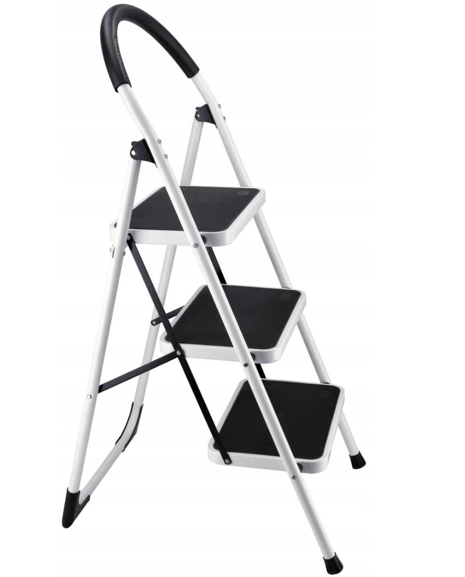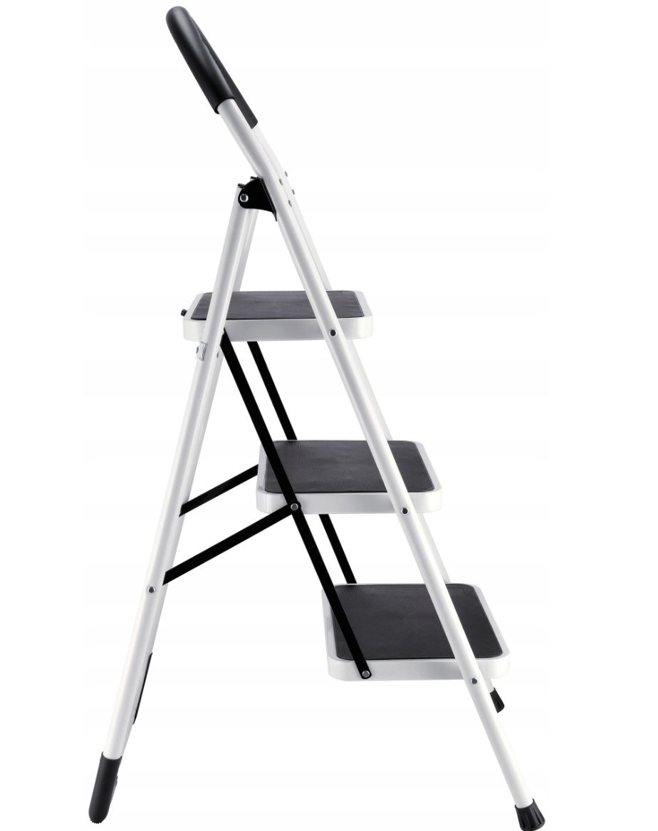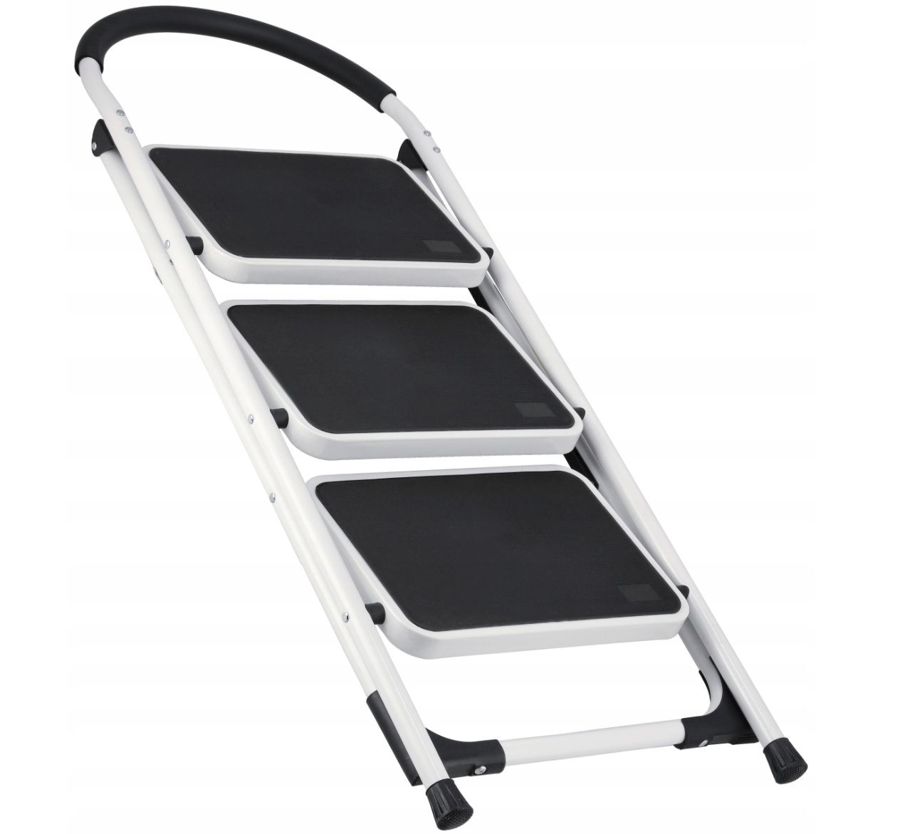 Žebřík má tři široké schůdky (38x26 cm), které jsou opatřeny protiskluzovými černými plastovými podložkami, které zajišťují bezpečnou a bezpečnou oporu. Na každém schůdku jsou gumové podložky, které zabraňují uklouznutí během používání. Rukojeť žebříku je potažena materiálem EVA, který je měkký a pohodlný, což zvyšuje komfort používání.