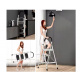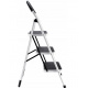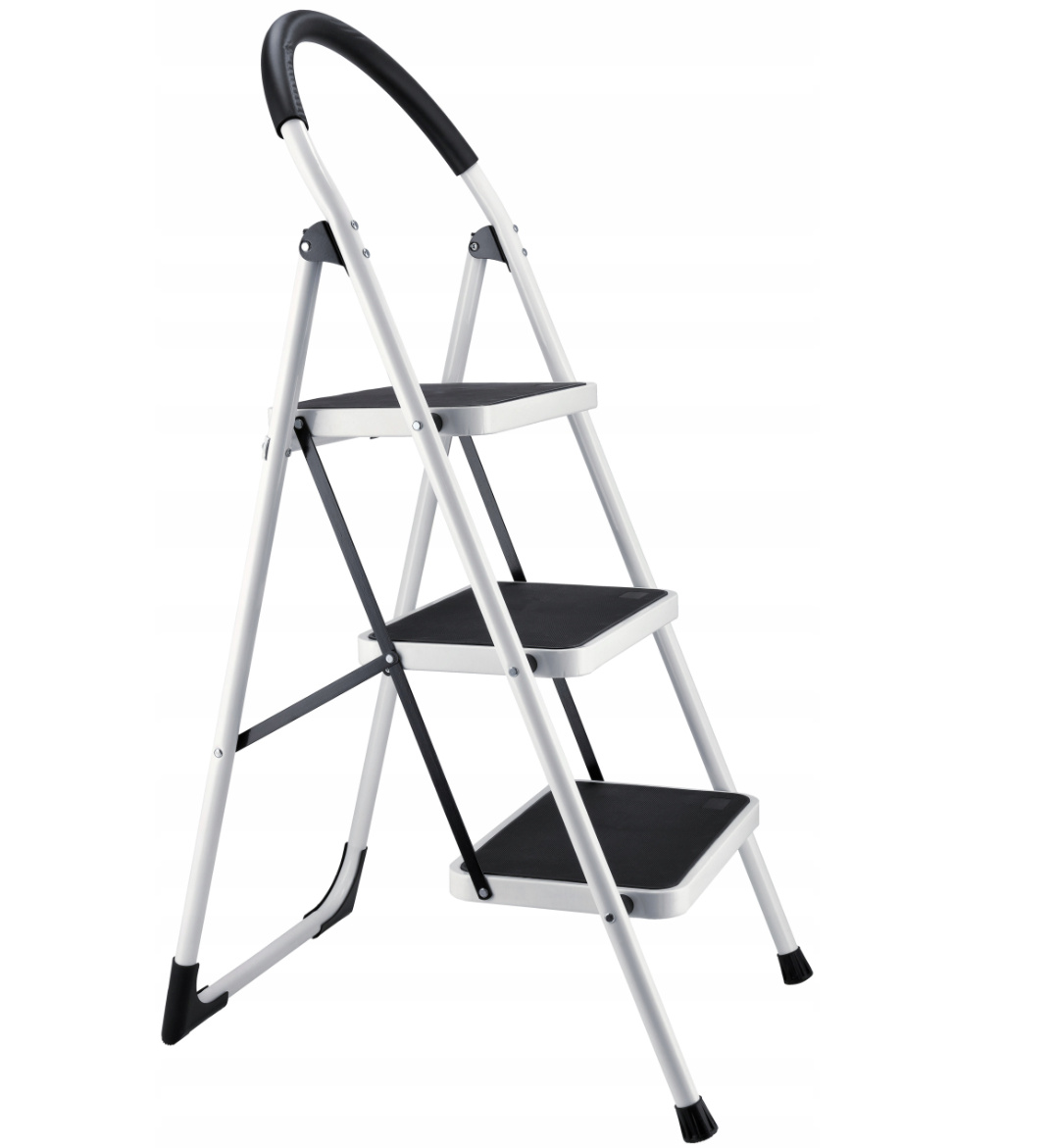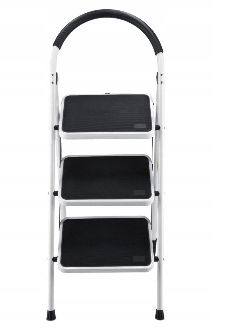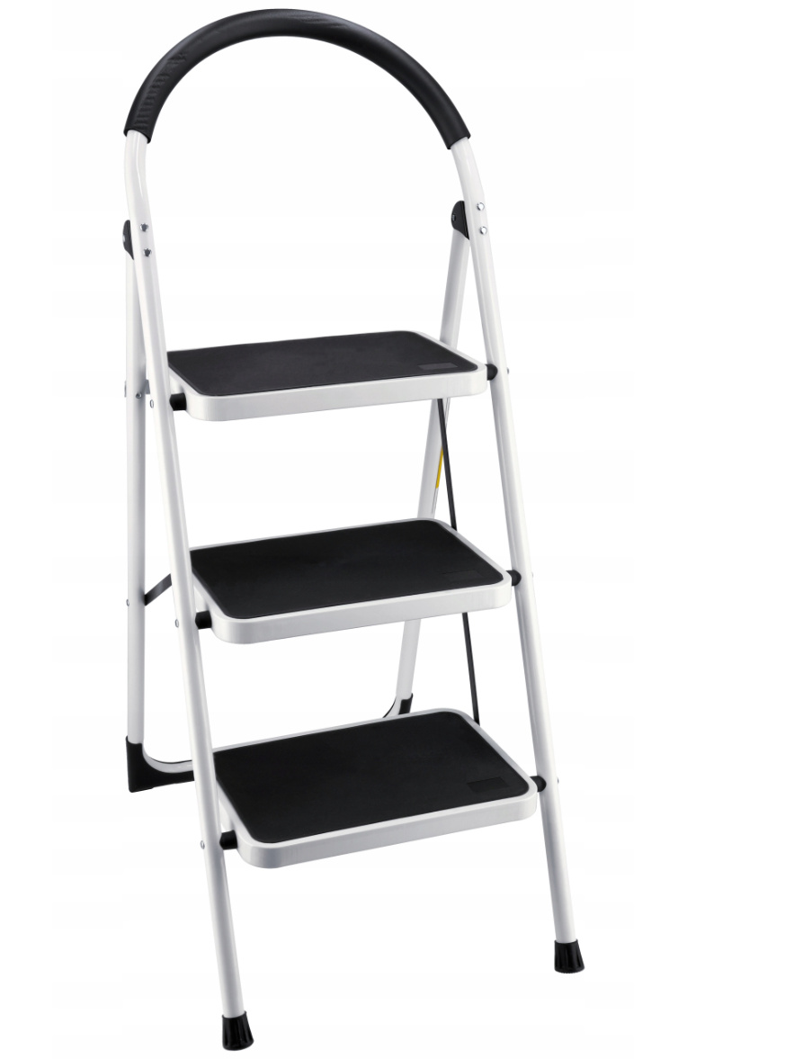 Žebřík má tři široké schůdky (38x26 cm), které jsou opatřeny protiskluzovými černými plastovými podložkami, které zajišťují bezpečnou a bezpečnou oporu. Na každém schůdku jsou gumové podložky, které zabraňují uklouznutí během používání. Rukojeť žebříku je potažena materiálem EVA, který je měkký a pohodlný, což zvyšuje komfort používání.
