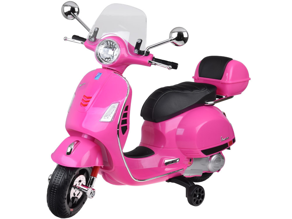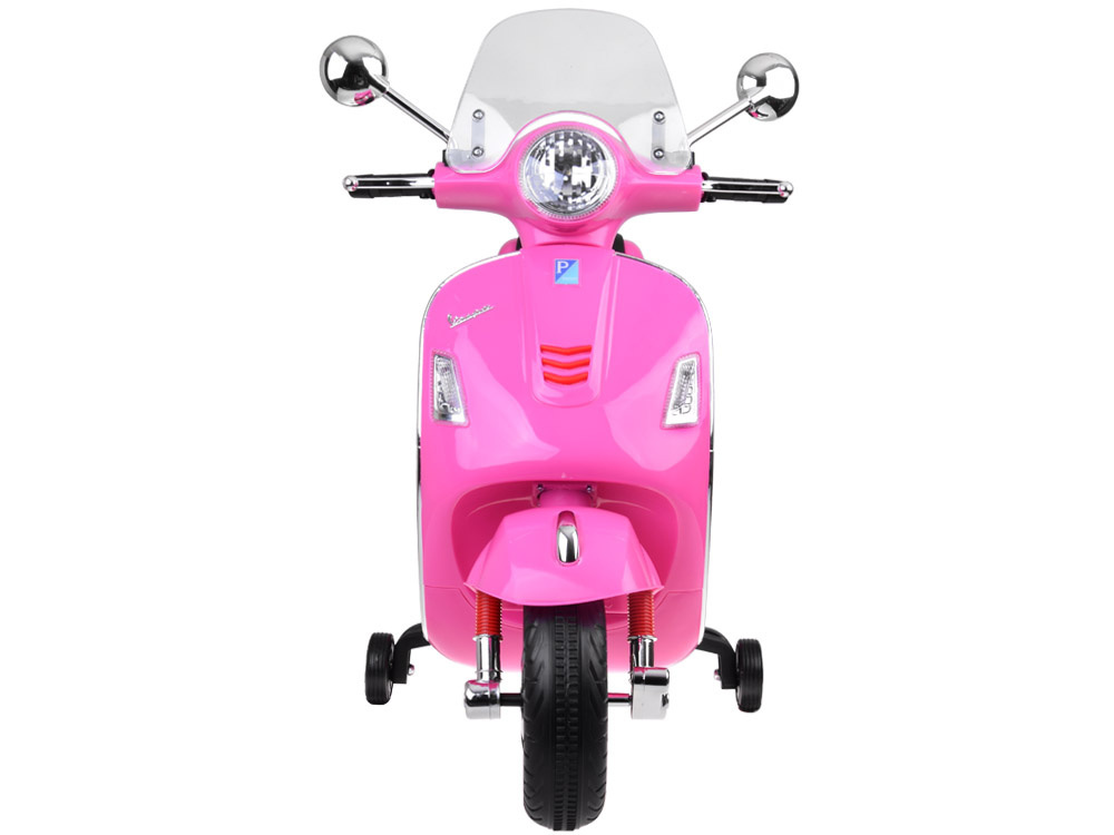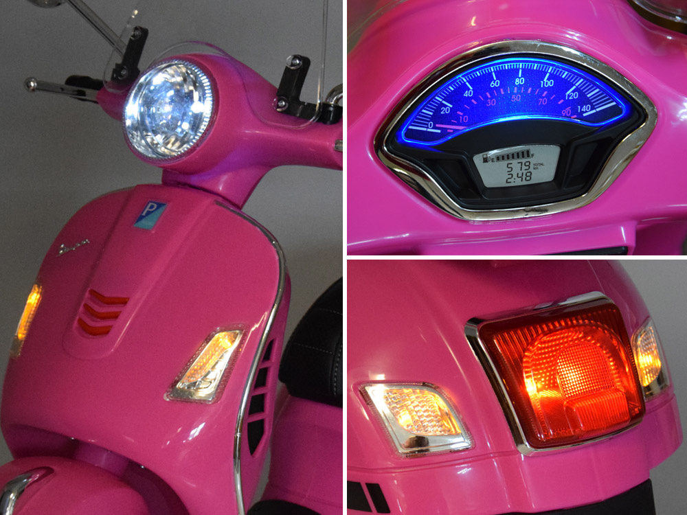 Skuter posiada oświetlenie przód+ tył, przez co pojazd wygląda jeszcze bardziej realistycznie. Jak przystało na dwukołowca, motorek został wyposażony w prędkościomierz (naklejka-atrapa), który również jest podświetlany! Dodatkowo Vespa posiada owiewkę, oraz lusterka boczne (atrapy). Dzięki dopracowanym detalom dziecko może poczuć się jak prawdziwy kierowca!
