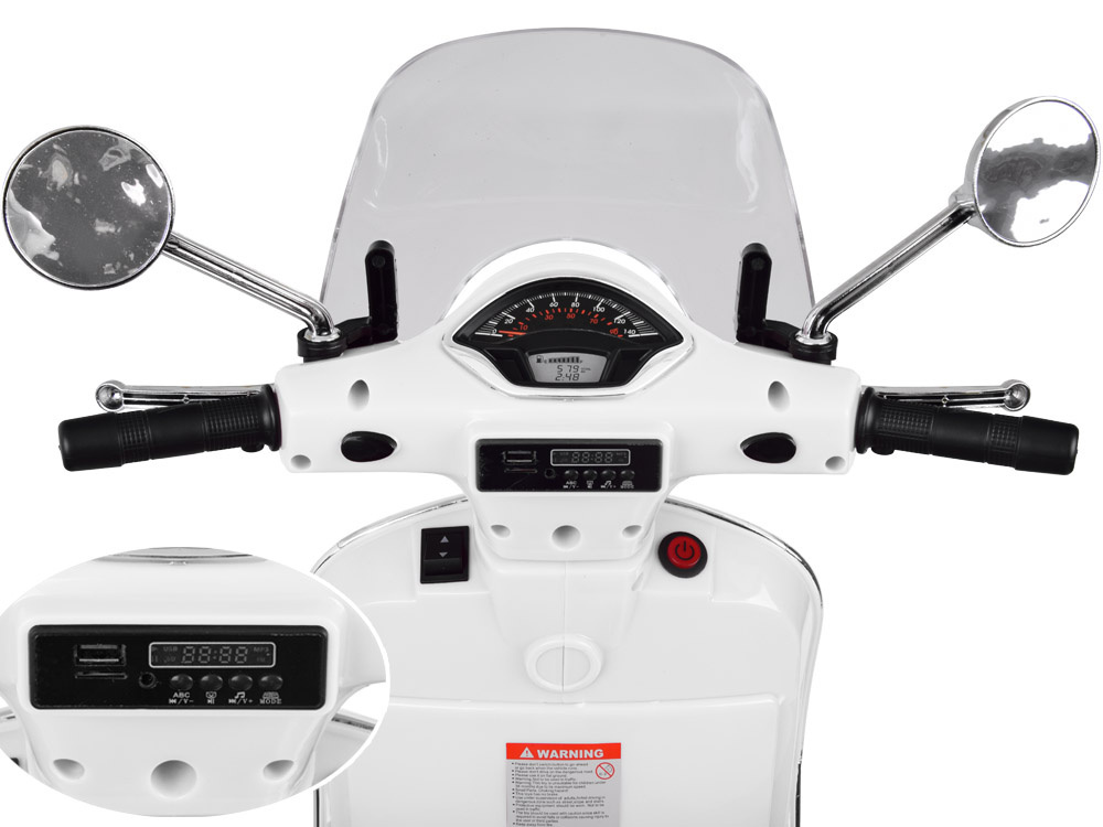 Skuter posiada oświetlenie przód+ tył, przez co pojazd wygląda jeszcze bardziej realistycznie. Jak przystało na dwukołowca, motorek został wyposażony w prędkościomierz (naklejka-atrapa), który również jest podświetlany! Dodatkowo Vespa posiada owiewkę, oraz lusterka boczne (atrapy). Dzięki dopracowanym detalom dziecko może poczuć się jak prawdziwy kierowca!