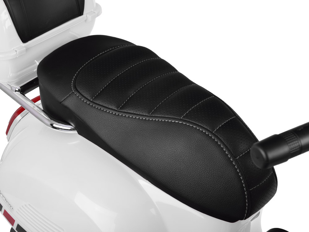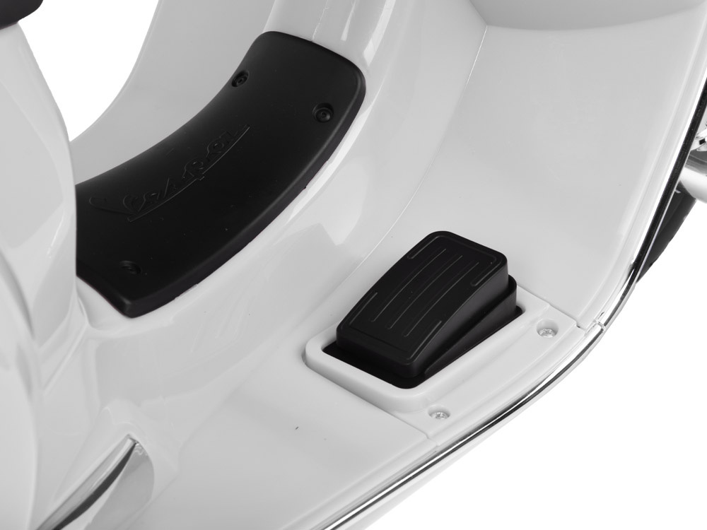 Vespa GTS została starannie dopracowana. Wygodne siodełko pokryte eko-skórą podnosi komfort jazdy. Ergonomiczne rączki z antypoślizgowymi wytłoczeniami sprawiają, że dziecko może pewnie prowadzić pojazd. Z myślą o bezpieczeństwie dziecka, pojazd został wyposażony w kółka boczne, gwarantujące stabilność podczas jazdy. Dodatkowo, Vespa posiada elektryczny hamulec, działający po zdjęciu nogi z pedałka gazu.