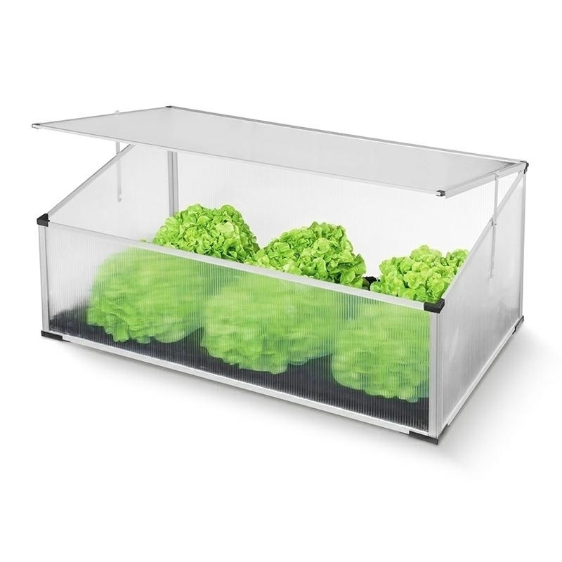 Szklarnia ogrodowa/panelowa do uprawy warzyw, sadzonek, kwiatów, ziół itp. Poszycie zostało wykonane z wytrzymałej płyty, która utrzymuje temperaturę, chroni rośliny przed mrozem, wiatrem i intensywnym deszczem. Specyfikacja: wymiar 100x60x40/30 cm materiał: rama aluminiowa (6 mm), płyty poliwęglanowe (4 mm) dach szklarni z 2 punktową regulacją otwarcia produkt nie posiada dna Płyty zabezpieczone są z obu stron folią ochronną. Wymiar kartonu: 101,5x63x3,5 cm Ilość na palecie: 56 szt.