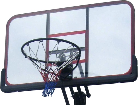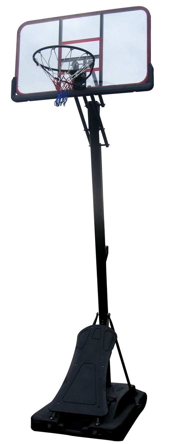 Mobiler, höhenverstellbarer Basketballkorb mit massiver, klarer Acryl-Rückwand, mit offiziellen Turniermaßen für Spiele auf höchstem Niveau.