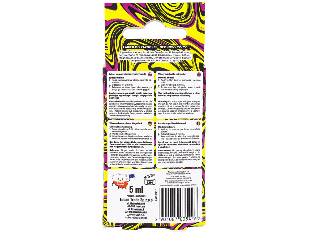 Neonowa odsłona lakieru do paznokci TUBI GLAM to nie tylko intensywny, żółty kolor, to przede wszystkim bezpieczeństwo użytkowania. Stworzony został tak, by był w 100% bezpieczny dla delikatnej płytki paznokcia dziecka. Do zmycia lakieru wystarczy ciepła woda i gąbka, dzięki czemu mała modnisia będzie mogła zmieniać kolor paznokcia nawet kilka razy dziennie.