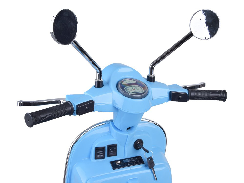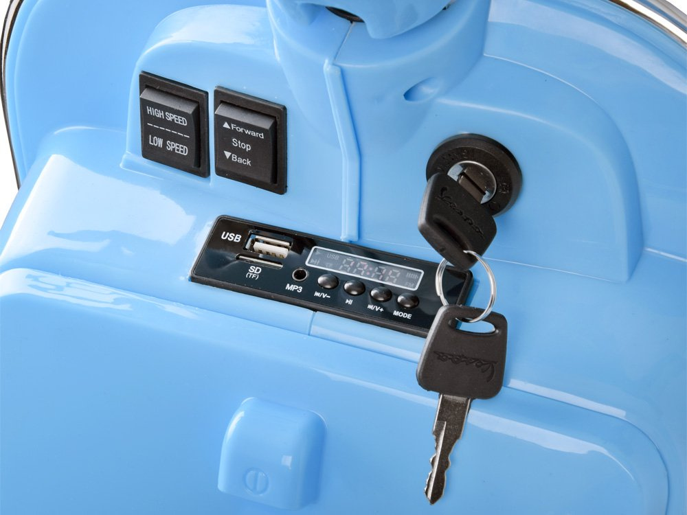 Das Fahrzeug verfügt über eine Reihe von Zubehörteilen, die das Spiel abwechslungsreicher machen. Wie bei einem echten Motorroller leuchten die Vorder- und Rücklichter während der Fahrt. Auf dem Armaturenbrett befindet sich ein beleuchteter Tachometer (Attrappe).Am Lenkrad befinden sich Tasten mit charakteristischen Melodien und darunter ein Hupsignal. Das Musik-Panel verfügt außerdem über einen MP3-, USB- und SD-Karten-Eingang, damit Ihr Kind während der Fahrt seine Lieblingslieder oder -geschichten hören kann.