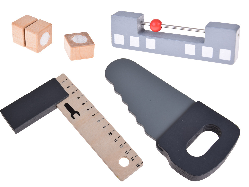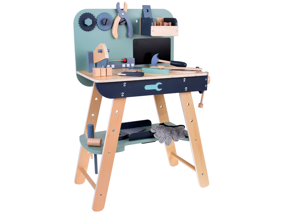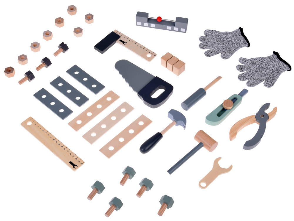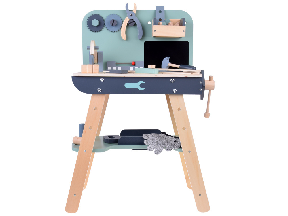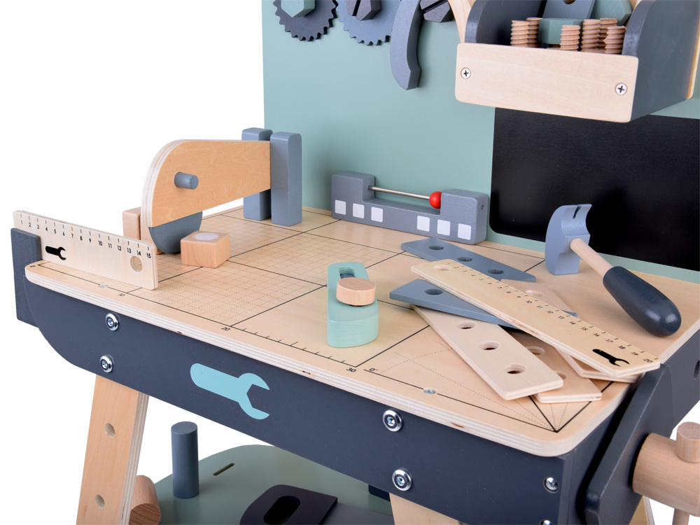Warsztat jest bogato wyposażony, dzięki czemu dziecko ma wiele opcji zabawy. Znajdziemy tu śrubki, nakrętki, deseczki do skręcania a także narzędzia takie jak: młotek, kleszcze, klucz, śrubokręt, piłkę, metr i kątownik a nawet imitację nożyka wysuwanego i poziomicy! Wszystkie akcesoria można wygodnie przechowywać na wygodnej półce. Dodatkowo warsztat wyposażony jest w "cięższy sprzęt" - imadło i piłę stołową! Do zestawu dołączone są kostki połączone rzepami, które można rozdzielać za pomocą piły. Dzięki temu zabawa jest jeszcze bardziej realistyczna! W warsztacie znalazło się również miejsce na małą tablicę kredową, na której można tworzyć projekty i zapisywać pomiary. BHP podczas pracy to ważna rzecz, dlatego w zestawie znajdziemy również parę rękawic, chroniących dłonie majsterkowicza podczas pracy.