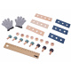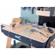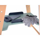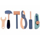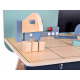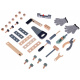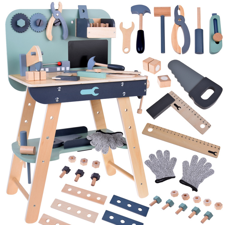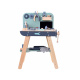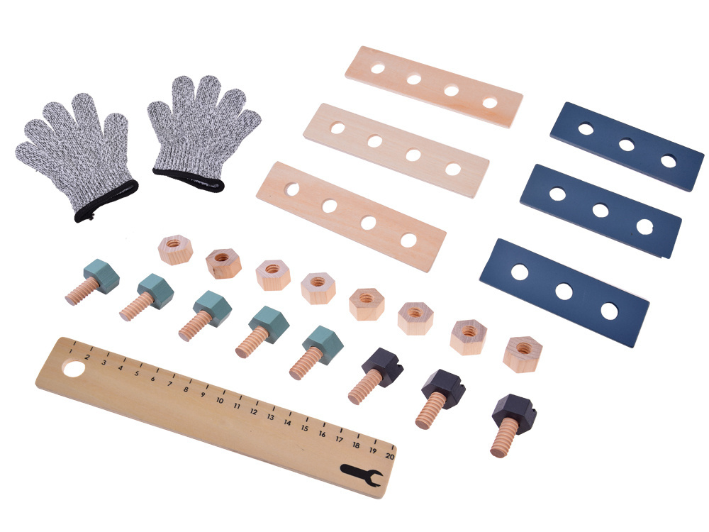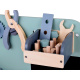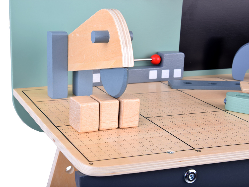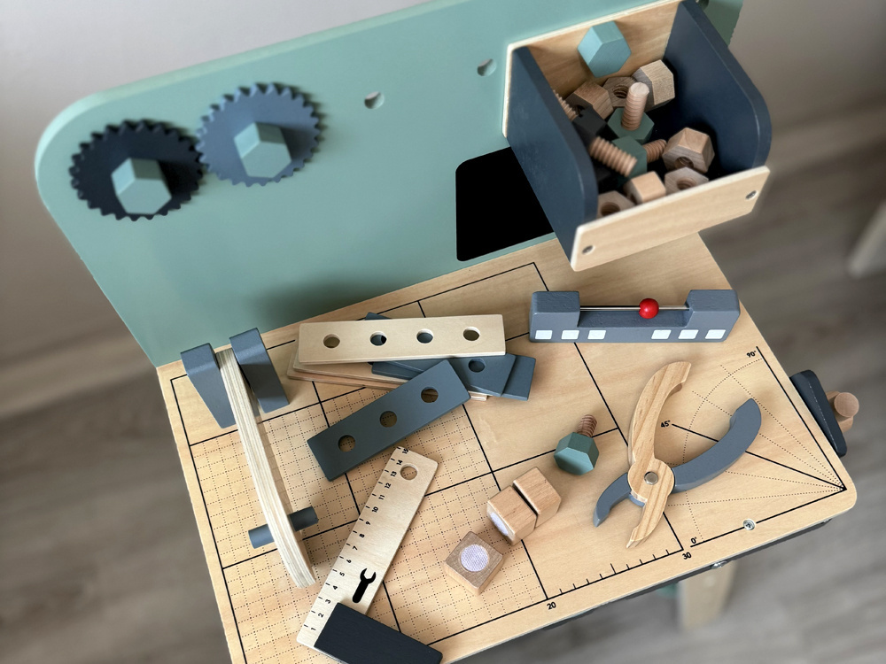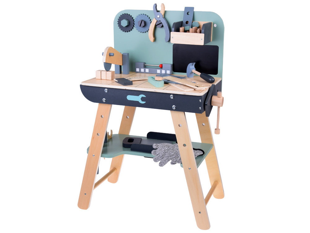 Warsztat jest bogato wyposażony, dzięki czemu dziecko ma wiele opcji zabawy. Znajdziemy tu śrubki, nakrętki, deseczki do skręcania a także narzędzia takie jak: młotek, kleszcze, klucz, śrubokręt, piłkę, metr i kątownik a nawet imitację nożyka wysuwanego i poziomicy! Wszystkie akcesoria można wygodnie przechowywać na wygodnej półce. Dodatkowo warsztat wyposażony jest w "cięższy sprzęt" - imadło i piłę stołową! Do zestawu dołączone są kostki połączone rzepami, które można rozdzielać za pomocą piły. Dzięki temu zabawa jest jeszcze bardziej realistyczna! W warsztacie znalazło się również miejsce na małą tablicę kredową, na której można tworzyć projekty i zapisywać pomiary. BHP podczas pracy to ważna rzecz, dlatego w zestawie znajdziemy również parę rękawic, chroniących dłonie majsterkowicza podczas pracy.