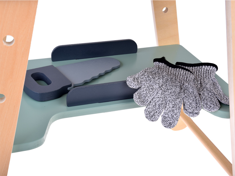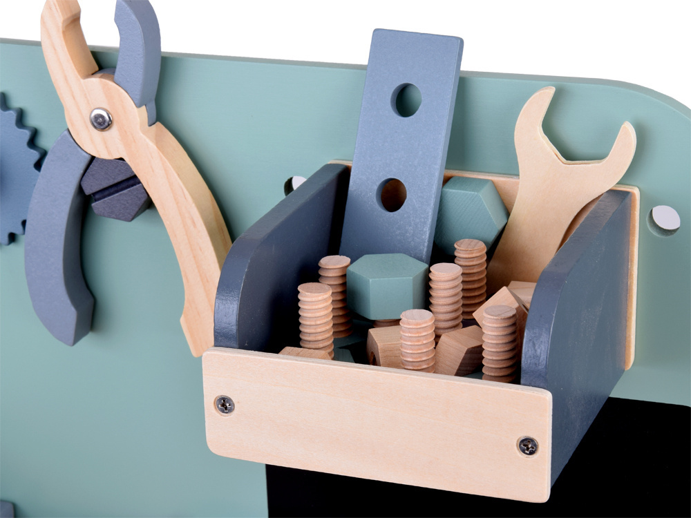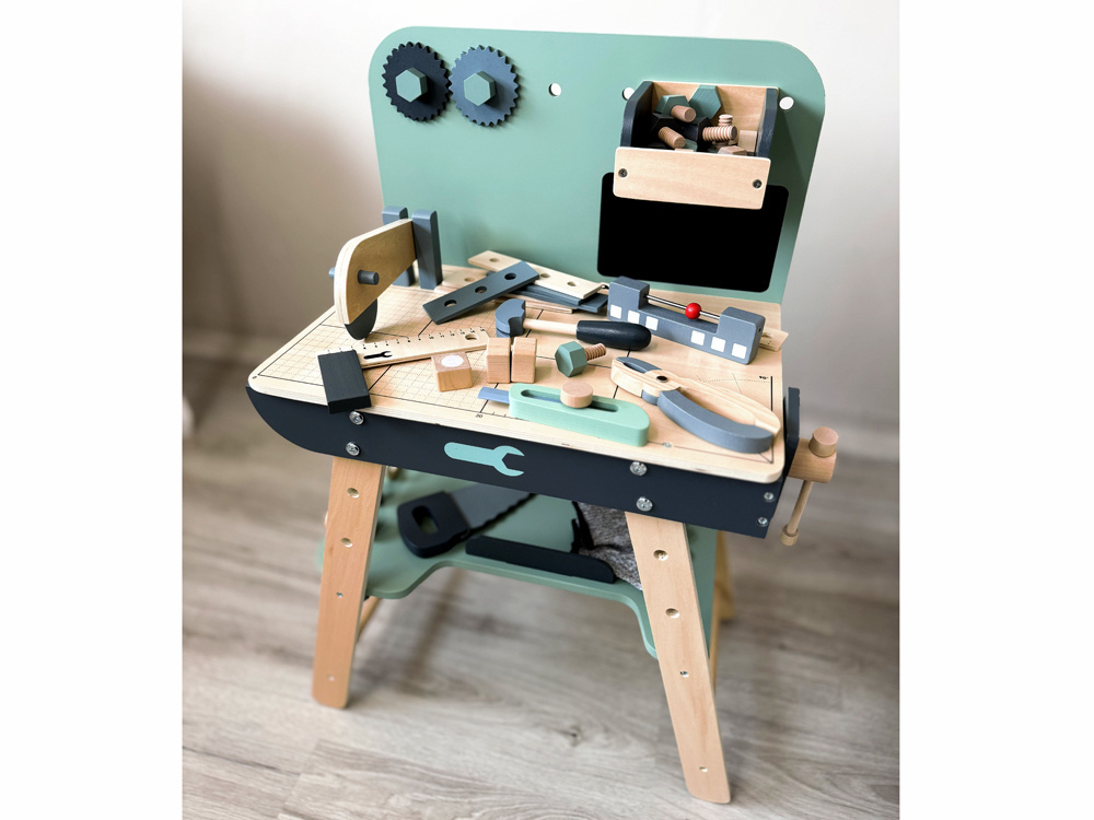 Warsztat został wykonany z solidnego drewna, częściowo pokrytego nietoksyczną farbą, co sprawia, że jest trwały a przede wszystkim bezpieczny. Naturalne drewno w połączeniu z odcieniami zieleni prezentuje się estetycznie i będzie ozdobą każdego dziecięcego kącika zabaw. Zaokrąglone, gładkie elementy gwarantują bezpieczną zabawę.