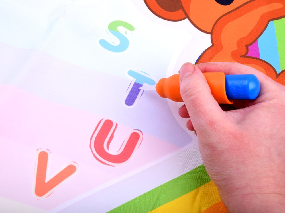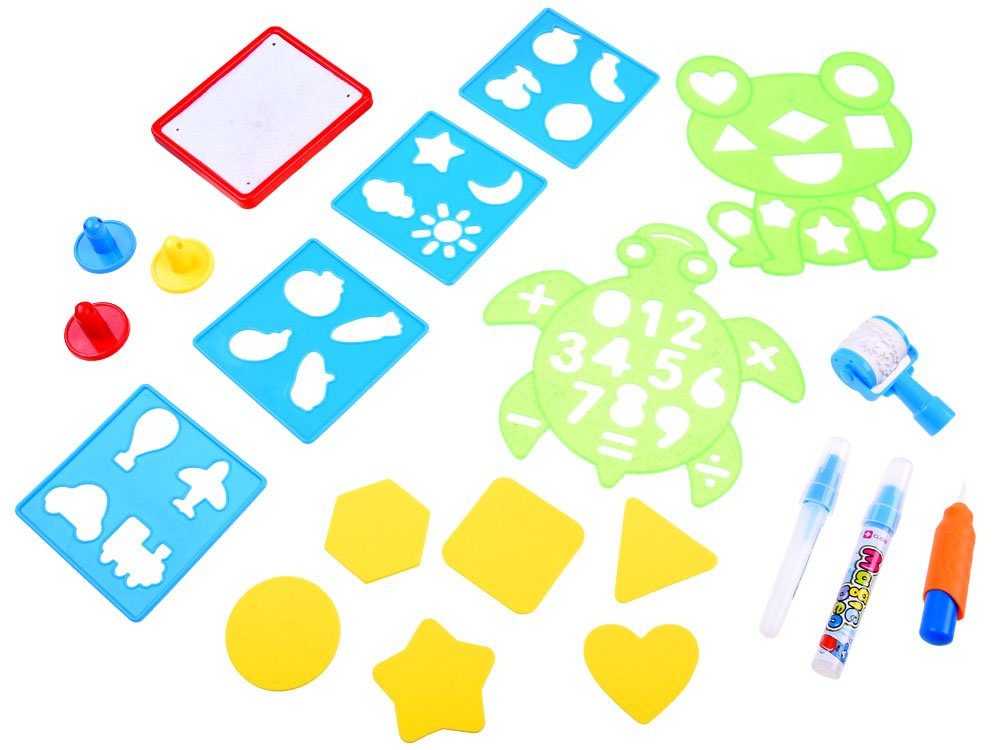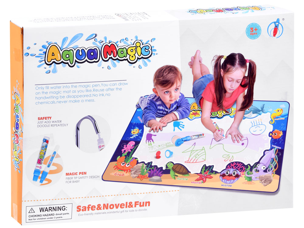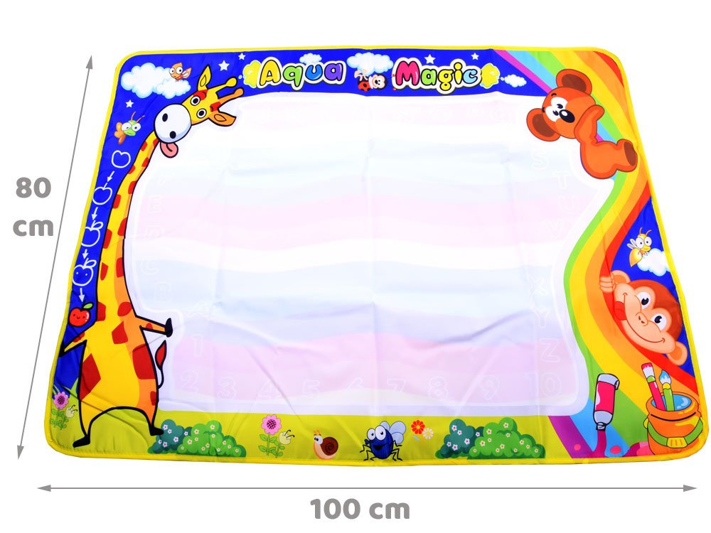 Mit derXXXL-Wassermatte kann jedes Kind Zeichnungen, Gemälde und mehr anfertigen. Die farbige Wassermatte mit den Maßen 80 x 100 cm hat einen farbigen Hintergrund, der bunte Zeichnungen ermöglicht. Das Alphabet und die Zahlen sind an den Rändern der Matte versteckt, so dass das Kind sie beim Spielen lernt. Das Spielen auf der Matte ist vollkommen sicher, denn man gießt einfach Wasser in den Marker und schon kann das Abenteuer des Zeichnens, Malens und Schreibens beginnen. Das Set enthält auch Stempel, Stanzformen, Pinsel, Musterrolle, einfach das komplette Paket! Es besteht keine Gefahr der Langeweile.