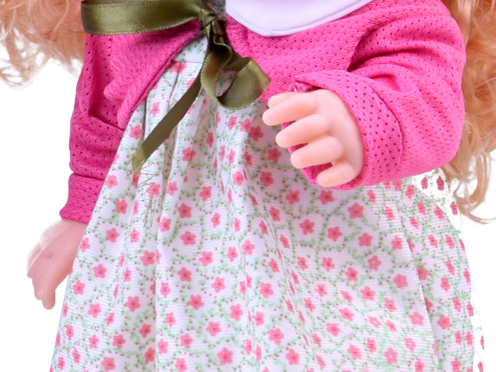 Die Puppe hat langes, dichtes Haar, das mit einem Stirnband und einer niedlichen Schleife gebunden ist. Sie trägt ein sehr mädchenhaftes Kleid, einen Pullover und Stiefel.