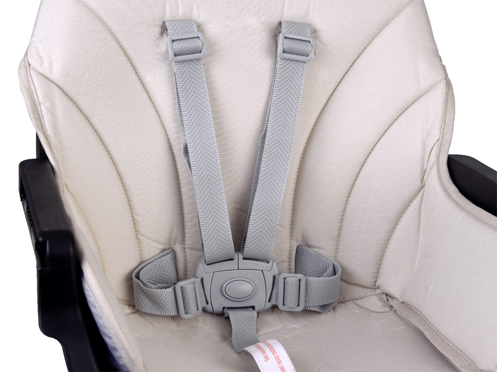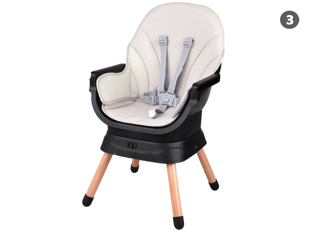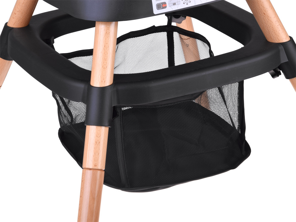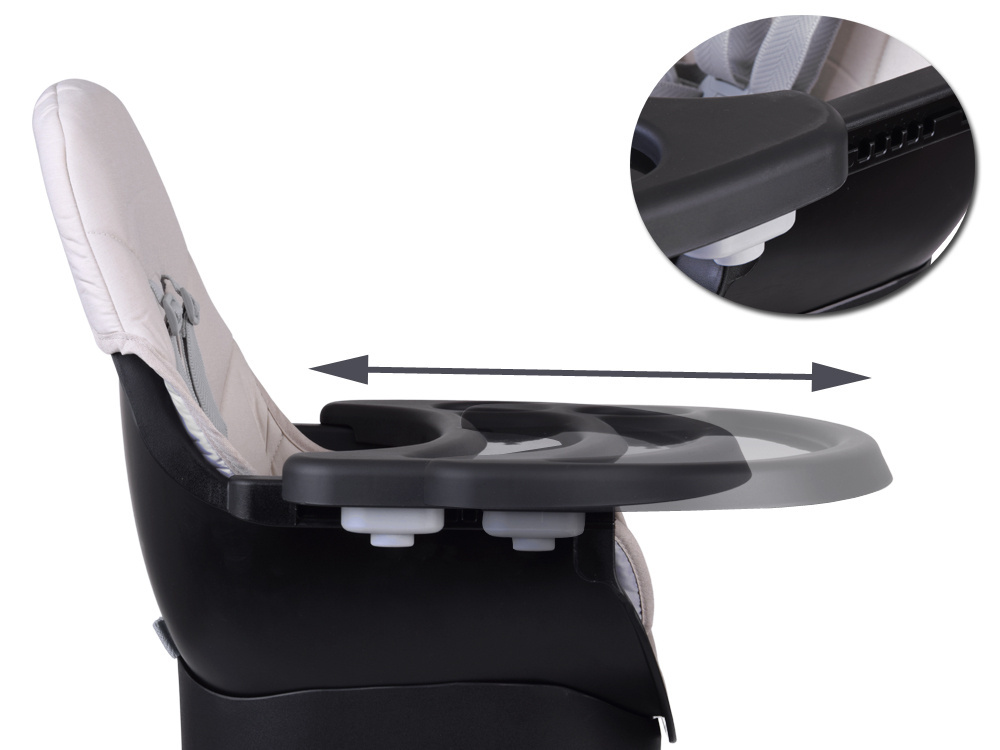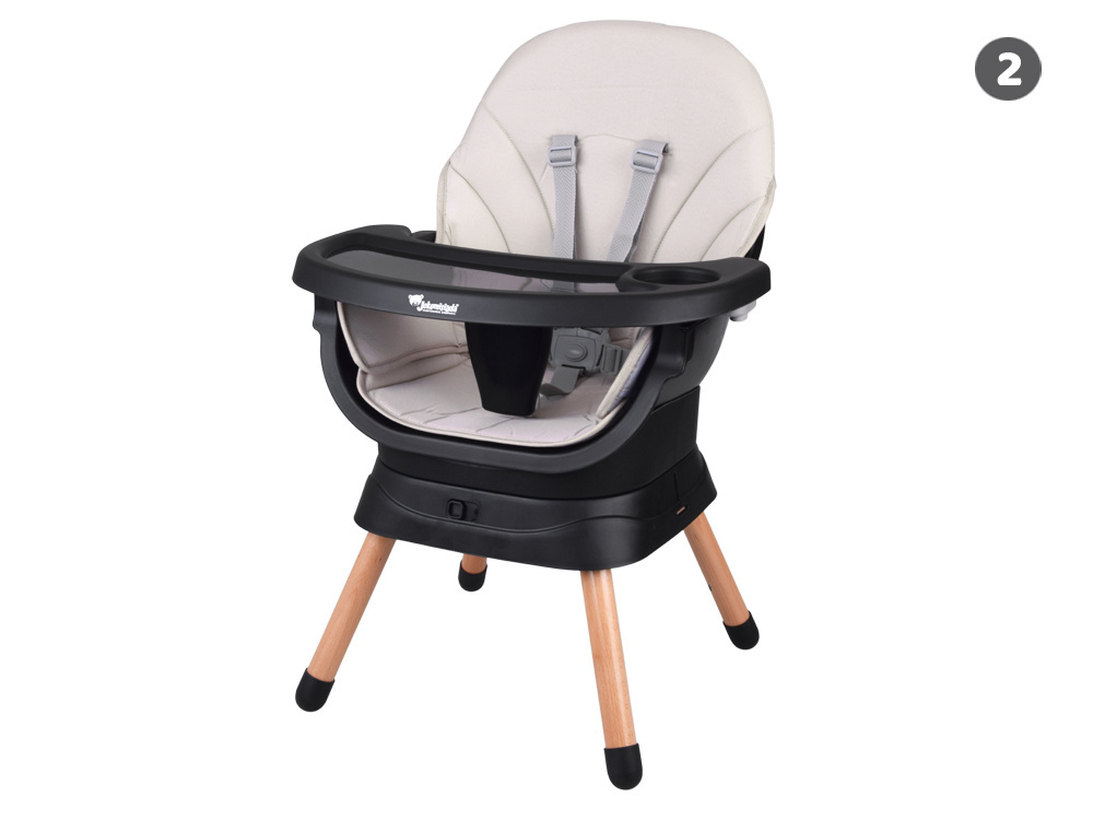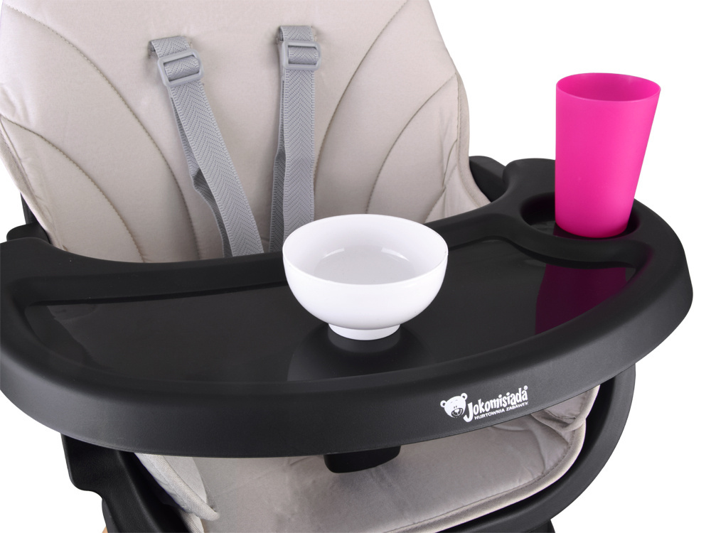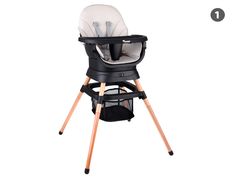 - Krzesełko do karmienia – wygodne i stabilne, z regulowaną tacką oraz pasami bezpieczeństwa, zapewnia komfort zarówno dziecku, jak i rodzicowi. Tacka jest profilowana, demontowana i łatwa w czyszczeniu – wystarczy przemyć pod bieżącą wodą lub włożyć do zmywarki. Dodatkowo, pod krzesełkiem znajdziemy praktyczny koszyczek na drobiazgi przydatne podczas karmienia np. tetrową pieluszkę, mokre chusteczki czy ulubioną zabawkę.