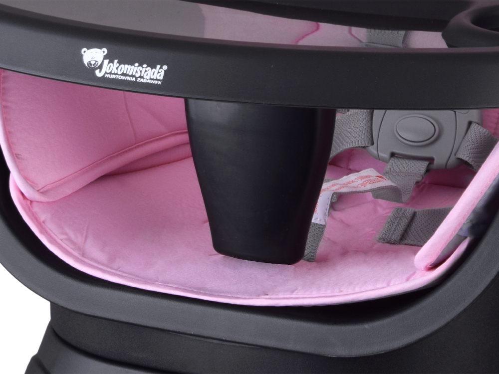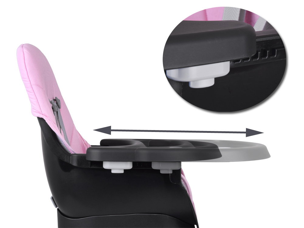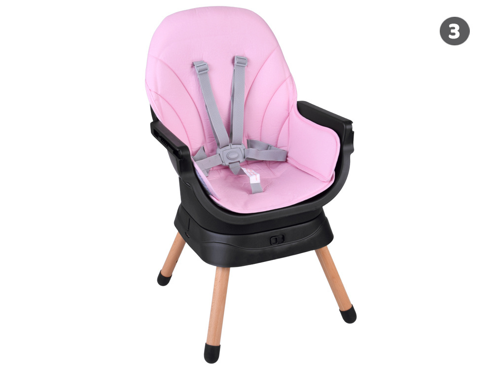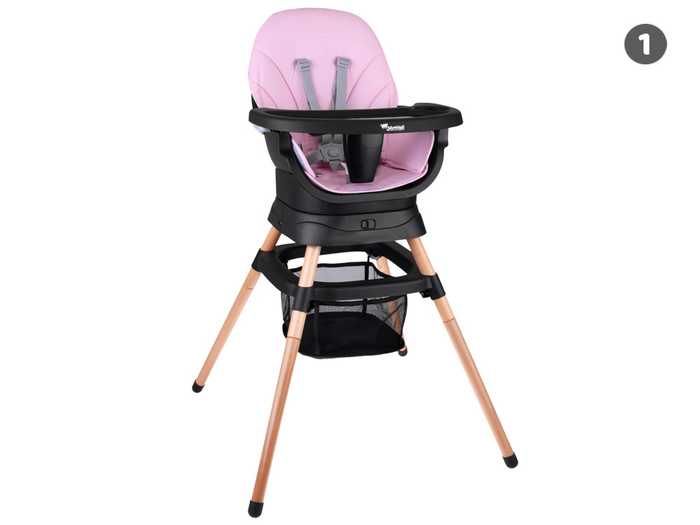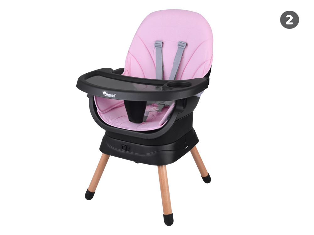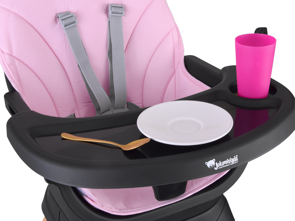 1. Krzesełko do karmienia – wygodne i stabilne, z regulowaną tacką oraz pasami bezpieczeństwa, zapewnia komfort zarówno dziecku, jak i rodzicowi. Tacka jest profilowana, demontowana i łatwa w czyszczeniu – wystarczy przemyć pod bieżącą wodą lub włożyć do zmywarki. Dodatkowo, pod krzesełkiem znajdziemy praktyczny koszyczek na drobiazgi przydatne podczas karmienia np. tetrową pieluszkę, mokre chusteczki czy ulubioną zabawkę.