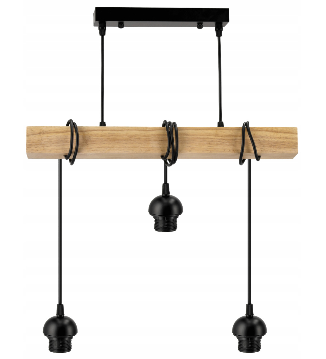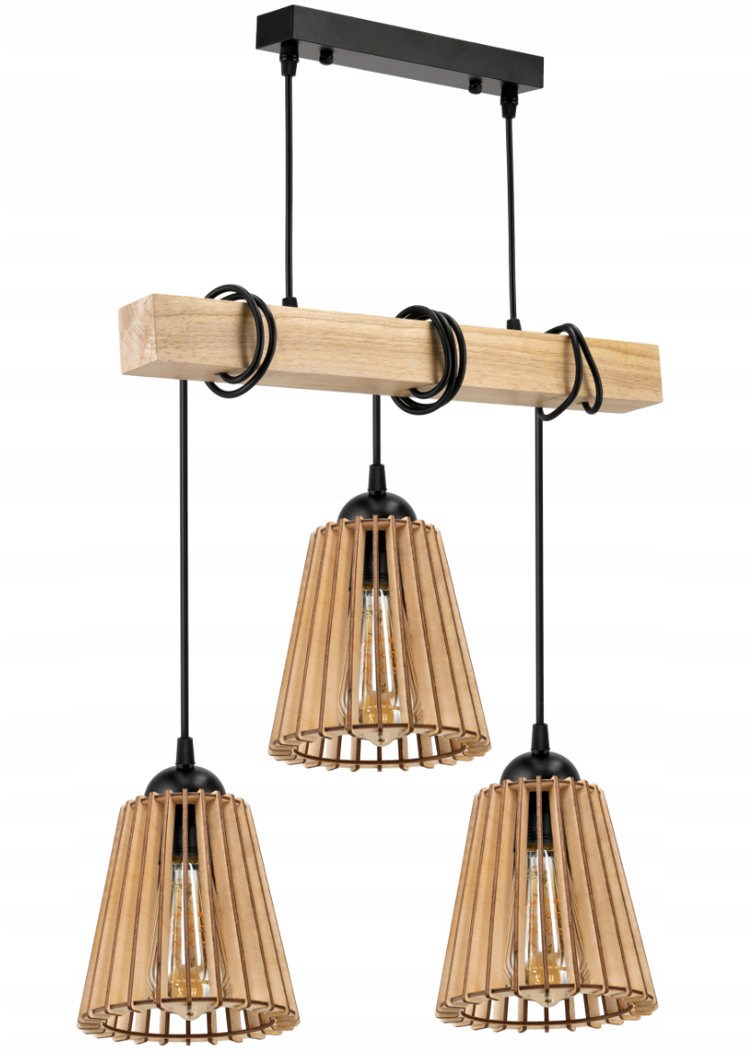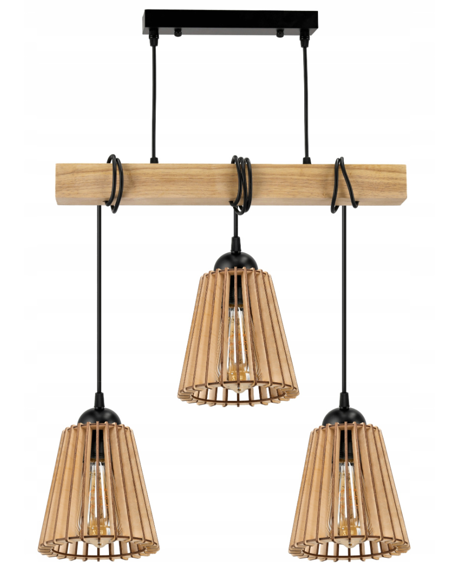 Technické údaje: Napájecí napětí : 230V Světelný zdroj : 3 x E27 (žárovky nejsou součástí sady) Svítidlo má držáky, na které lze přišroubovat stínidla - dřevěná stínidla Základní materiál : Ocel + dřevo Barva montáže : Černá Maximální příkon jediný zdroj světla : 60W (wolframové žárovky) / 20W (LED) Certifikáty : CE, RoHS Další vlastnosti : Vestavěná montážní kostka pro snadné připojení, nastavení výšky pomocí kabelů a paprsku