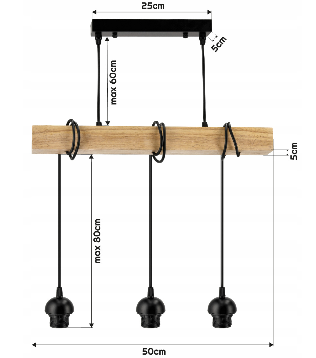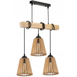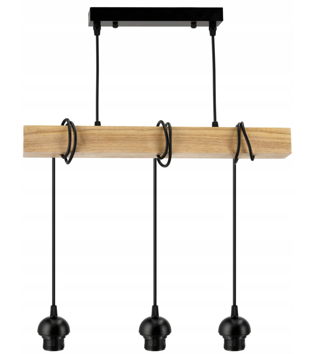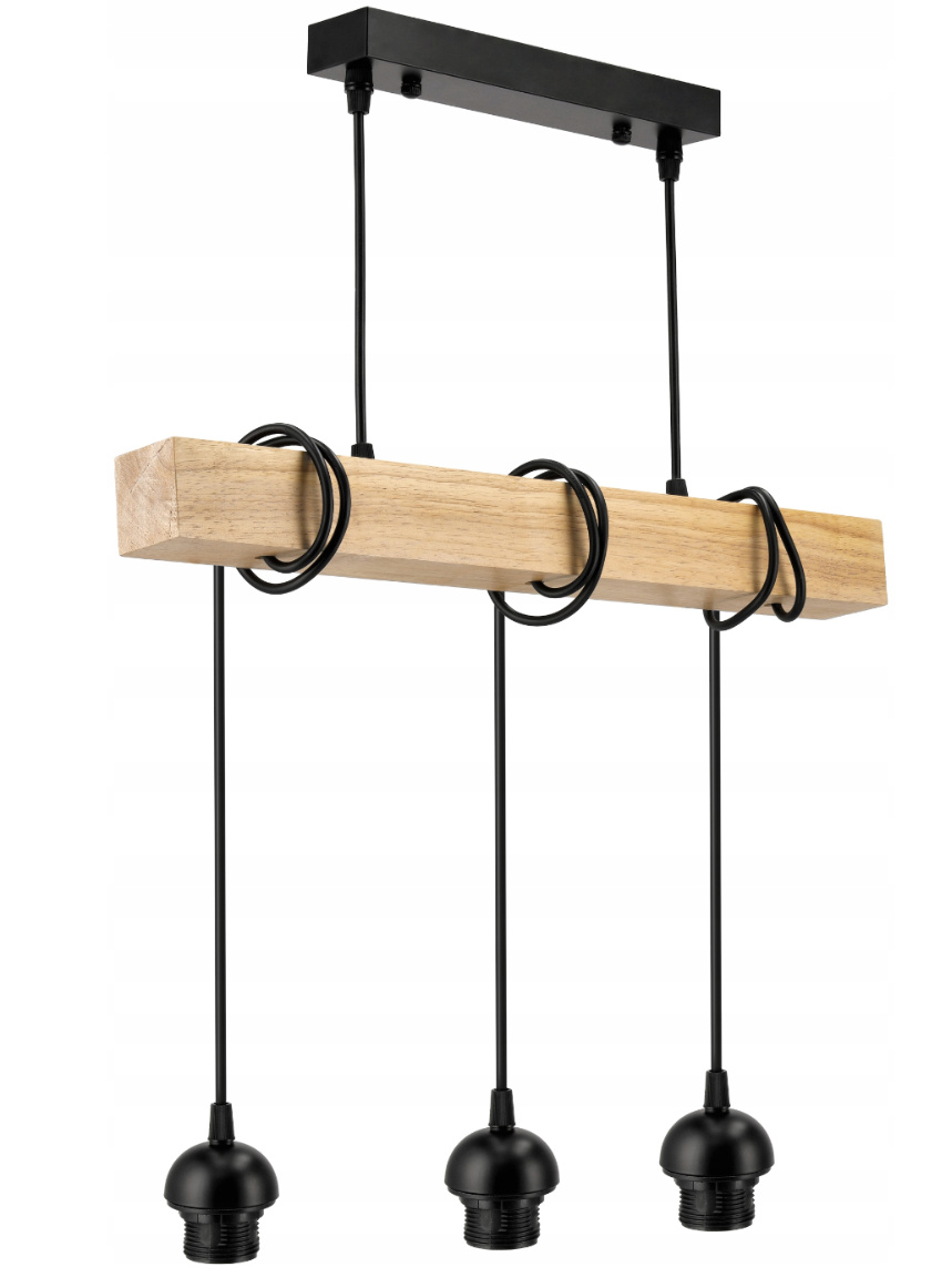 Technické údaje: Napájecí napětí : 230V Světelný zdroj : 3 x E27 (žárovky nejsou součástí sady) Svítidlo má držáky, na které lze přišroubovat stínidla - dřevěná stínidla Základní materiál : Ocel + dřevo Barva montáže : Černá Maximální příkon jediný zdroj světla : 60W (wolframové žárovky) / 20W (LED) Certifikáty : CE, RoHS Další vlastnosti : Vestavěná montážní kostka pro snadné připojení, nastavení výšky pomocí kabelů a paprsku
