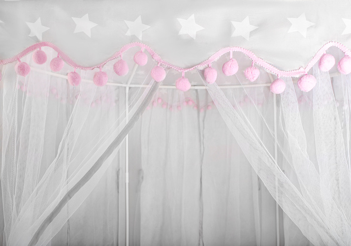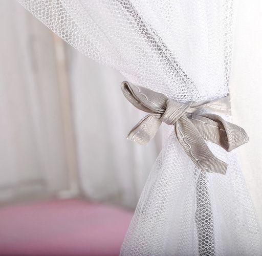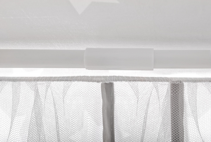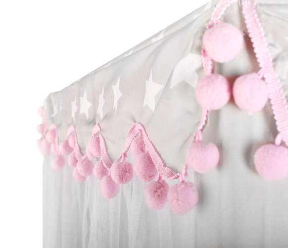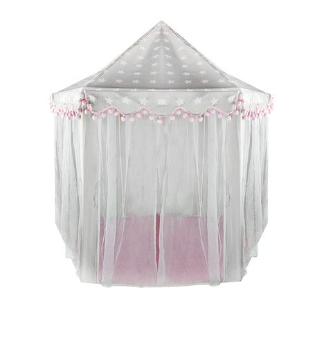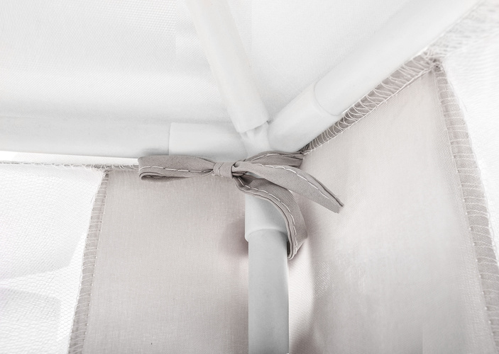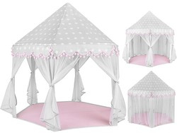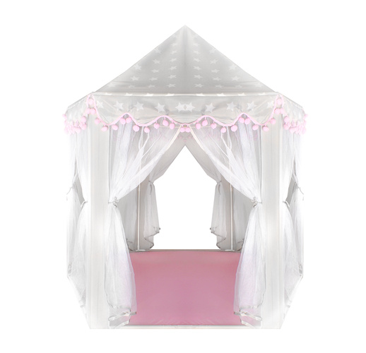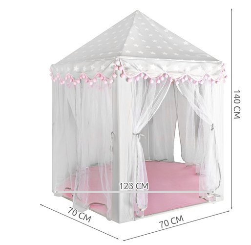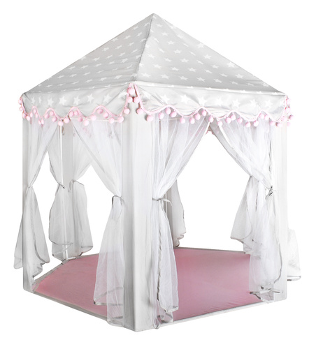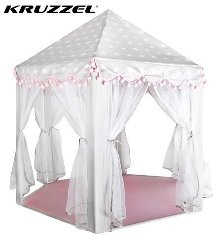 Der Materialreißverschluss ist definitiv ein unverzichtbarer Begleiter bei den Spielereien der Kinder.Es hat eine sechseckige Basis, 6 Eingangsöffnungen und ein konisches Visier. Die Eingänge sind mit durchsichtigen weißen Vorhängen bedeckt, die perfekt mit dem Rest des Zeltes verschmelzen. Gardinen können auf verschiedene Arten mit dekorativen Bändern gebunden oder drapiert werden. Die Verwendung von Schleifen verleiht Charme und bringt Abwechslung in den Spaß.